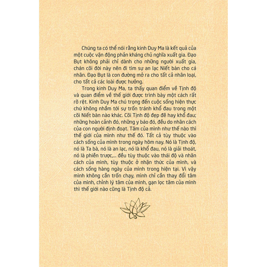 Chúng ta có thể nói rằng kinh Duy Ma là kết quả của một cuộc vận động phản kháng chủ nghĩa xuất gia. Đạo Bụt không phải chỉ dành cho những người xuất gia, chán cõi đời này nên đi tìm sự an lạc Niết bàn cho cá nhân. Đạo Bụt là con đường mở ra cho tất cả nhân loại, cho tất cả các loài được hưởng.