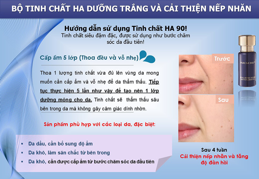 Với Parcimonie Hyaluronic Acid 90 Soothing Booster có tác dụng hiệu quả trong việc dưỡng trắng da an toàn và phù hợp với mọi loại da đồng thời nuôi dưỡng làn da khỏe mạnh, tăng độ đàn hồi và giúp da tràn đầy sức sống và cải thiện nhanh chống tình trạng khô da.