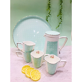 ✨Bộ trà sứ xương cao cấp cốc cao chấm bi xanh ROYAL 5546