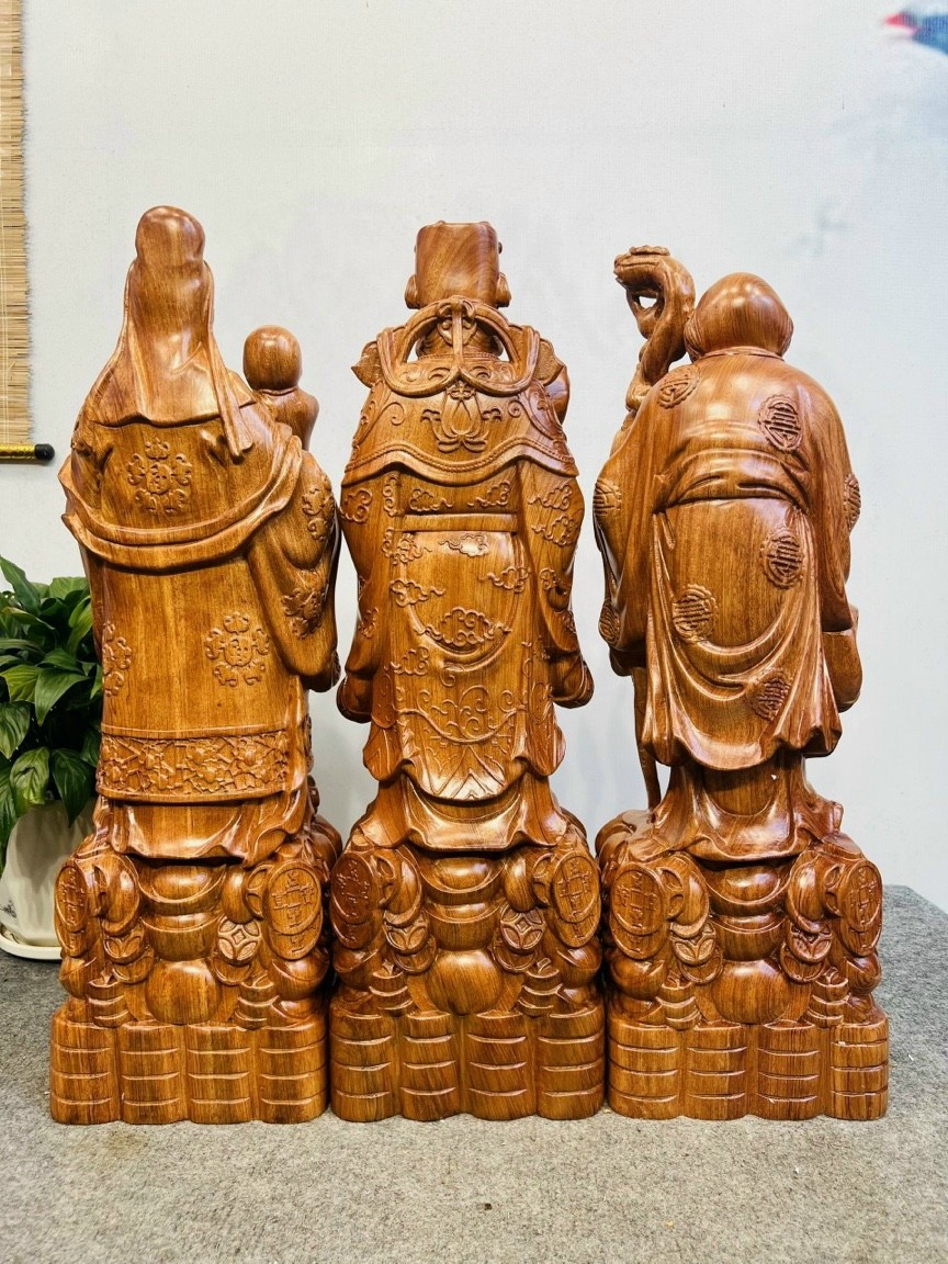 Bộ tượng phật tam đa phúc lộc thọ được làm bằng chất liệu gỗ hương đá liền khối tự nhiên 100% Kt cao 60×18×14,5cm _ Bộ tượng phật tam đa được điêu khắc trạm trổ vô cùng tỉ mỉ ,tinh sảo kỳ công .Đi hầu hết tất cả mọi chi tiết góc nội dung hoa văn của tượng đều được gọt tỉa chỉnh sửa cực kỳ sắc nét ,hoàn toàn bằng tay thủ công .Đồng thời bộ tượng được kiểm định kỹ lưỡng khắt khe ,như cho vào thẩm sấy cho gỗ khô kiệt .Mục đích trống dập nứt vênh mo mối mọt ,kết hợp với trà nhám ,đánh giấy giáp nhiều nước sờ mát lạnh .Song cho vào phun lót làm bóng mờ ,để giữ lại mầu sắc vân gỗ tữ nhiên .Bộ tượng phật được làm và hoàn thiện ,do bàn tay khối óc tài hoa .Từ những người thợ dầy rặn kinh nghiệm ,cũng như tay nghề cao trong làng nghề truyền thống .Chính vì thế bộ tượng phật tam đa phúc lộc thọ gỗ hương đá đã đáp ứng đầy đủ mọi tiêu trí cần thiết như ( Đẹp bền rẻ ) Thẩm mỹ nghệ thuật với chất lượng tuyệt vời