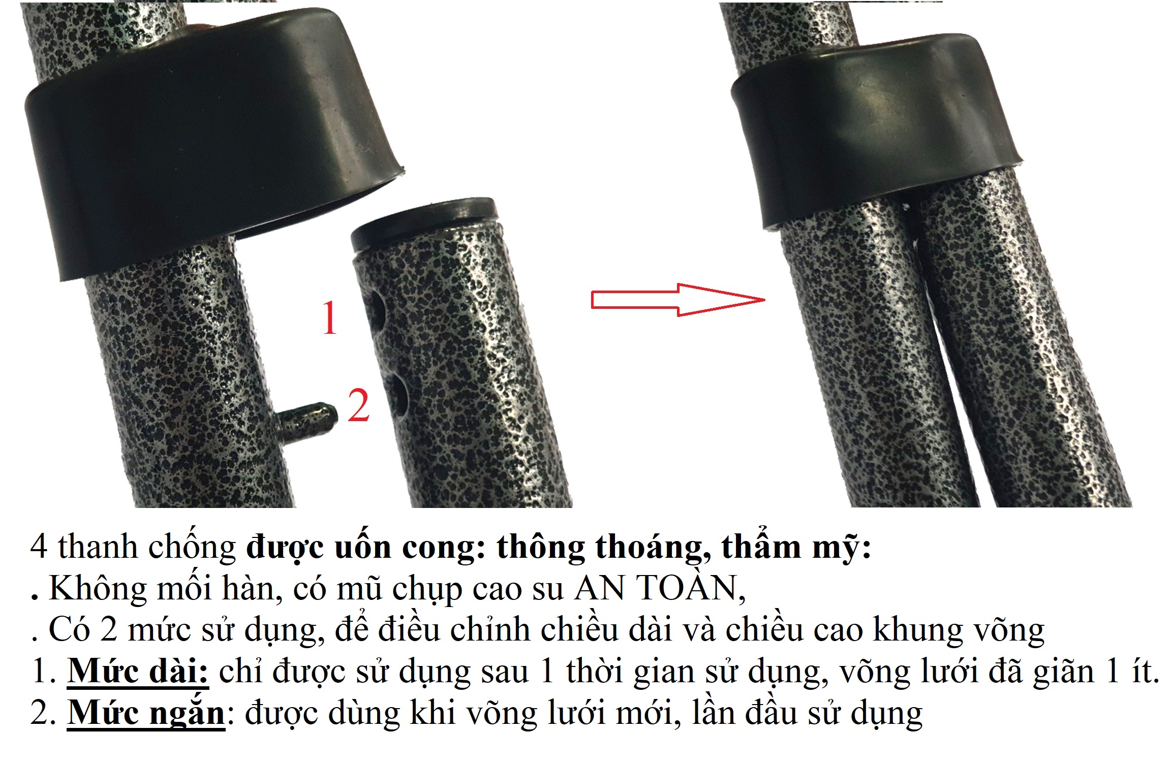 Ống thép, sơn tĩnh điện. đường kính 27.0mm, chiều dày 0.9mm. 4 thanh chống uốn cong, thẩm mỹ, thông thoáng, an toàn. Võng lưới sợi 100% polyester, mềm mịn, có độ co giãn, lưới Xuất