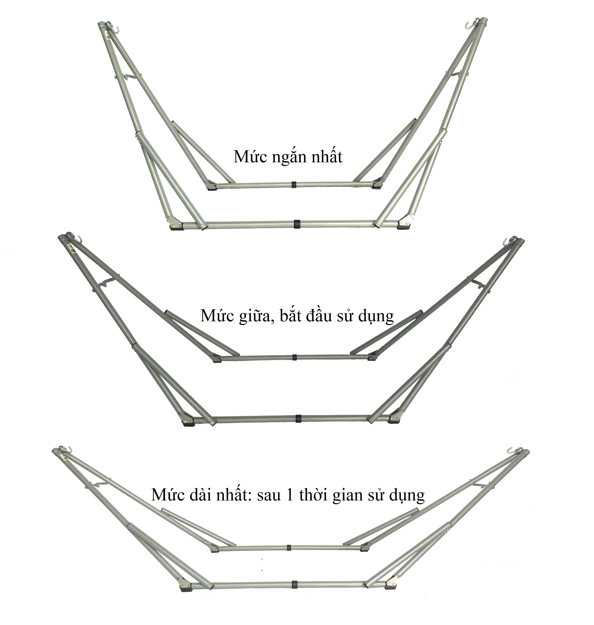 * Khung võng xếp bằng ống thép: sơn tĩnh điện, đường kính 32.0mm, chiều dày 0.7mm,4 thanh chống cong:điều chỉnh độ dài & độ cao của khung võng. * Kích thước sử dụng: trung bình