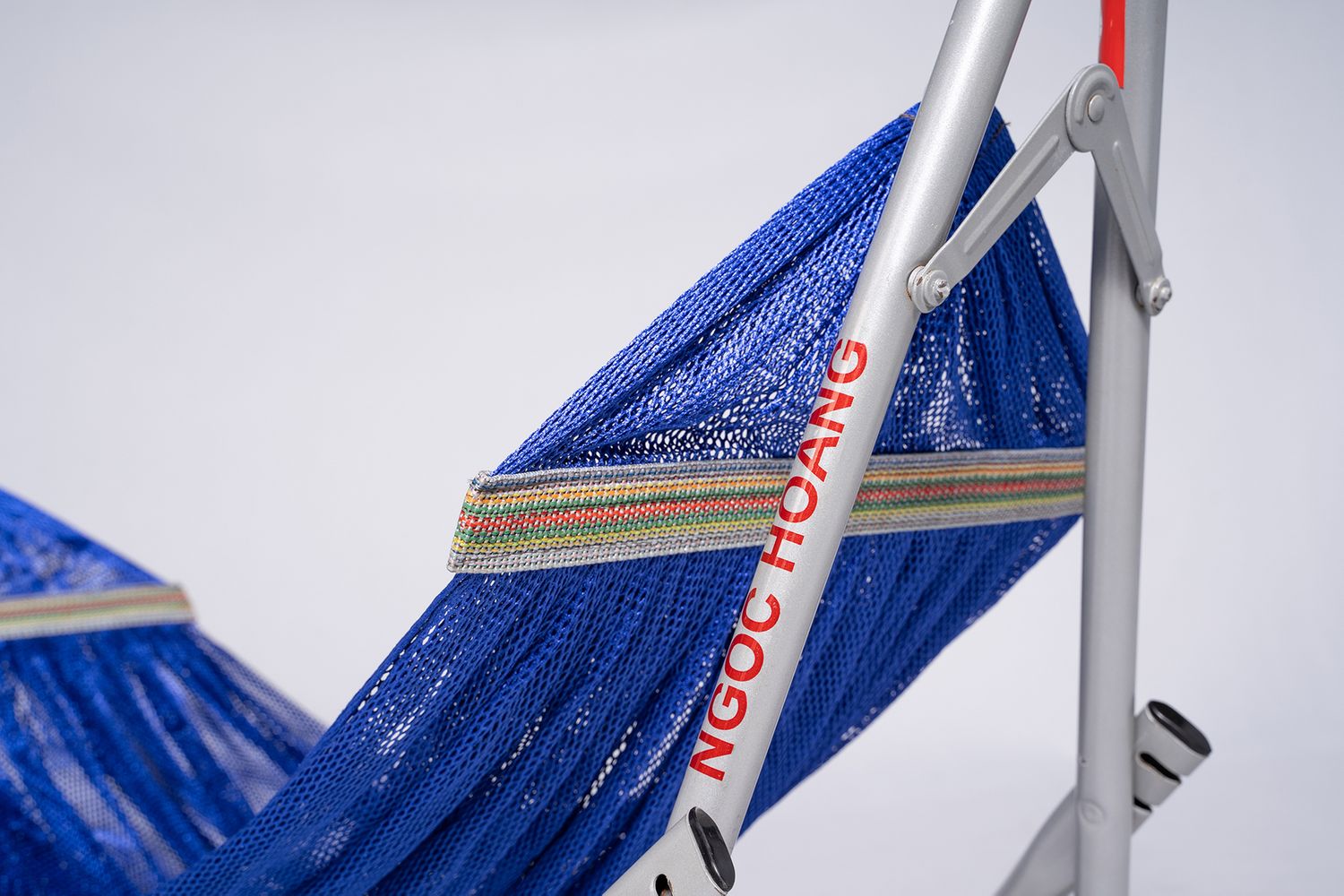 Ống thép, sơn tĩnh điện. đường kính 27.0mm, chiều dày 0.9mm. 4 thanh chống uốn cong, thẩm mỹ, thông thoáng, an toàn. Võng lưới sợi 100% polyester, mềm mịn, có độ co giãn, lưới Xuất