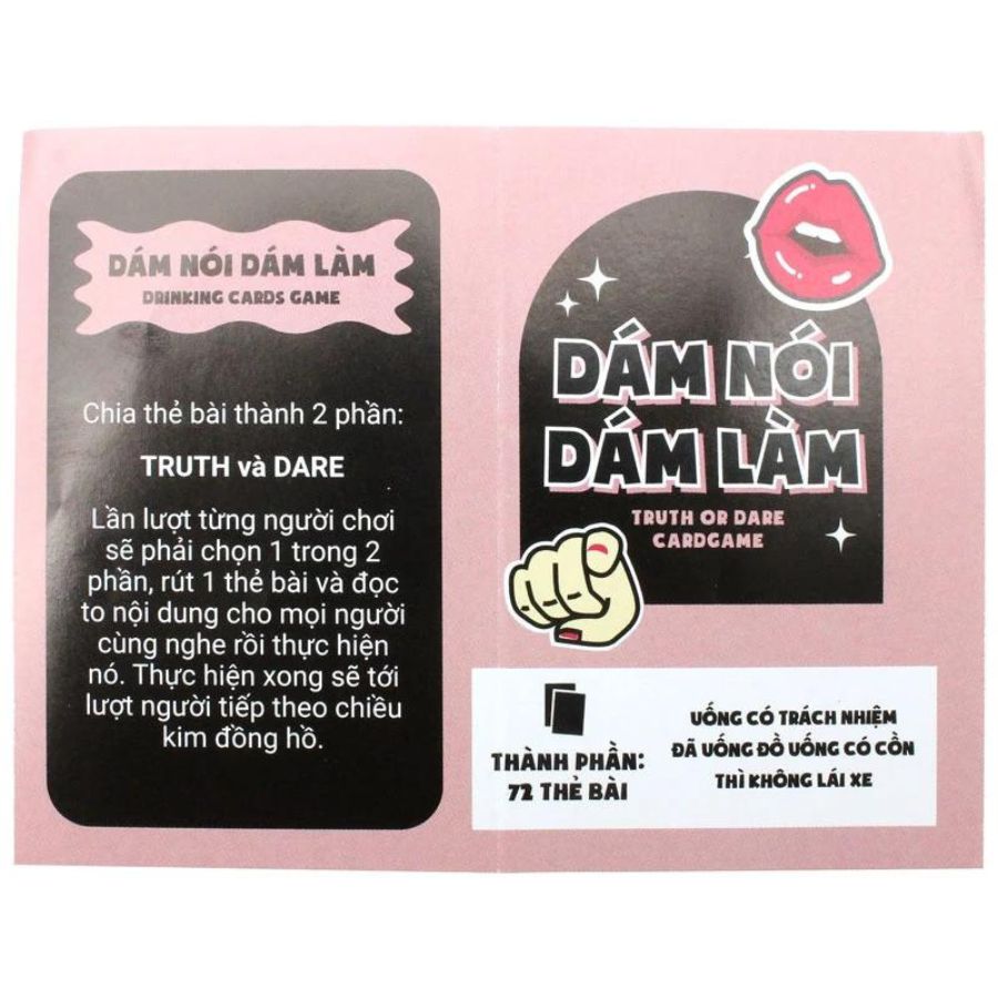 Giới thiệu Boardgame Dám Nói Dám Làm - Truth Or Dare Game - BGV Những buổi ăn nhậu đầy thức uống ngon và mồi thơm nghe thì cũng thích đấy, nhưng bạn đã thử vừa chill vừa chơi Truth Or Dare game chưa? Hứa hẹn là vui banh nóc luôn! Tạm biệt những buổi gặp mặt tẻ nhạt và nhàm chán, cuộc vui của bạn sẽ thêm phần thú vị với hàng loạt thẻ bài siêu bựa sẽ giúp bạn đẩy nhanh quá trình “gãy” của những đứa khác trên bà Lưu ý: Uống có trách nhiệm - đã uống rượu bia thì không lái xe. Gồm 72 thẻ bài - Chia thẻ bài thành 2 phần: TRUTH và DARE Lần lượt từng người chơi sẽ phải chọn 1 trong 2 phần, rút 1 thẻ bài và đọc to nội dung cho mọi người cùng nghe rồi thực hiện nó. Thực hiện xong sẽ tới lượt người tiếp theo chiều kim đồng hồ.