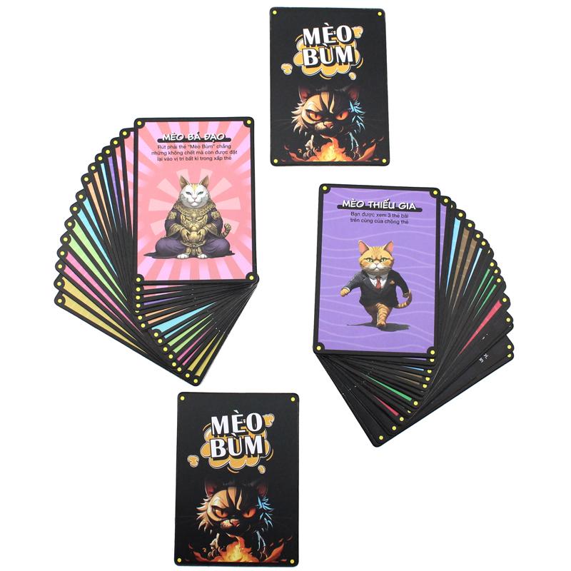 Boardgame Mèo Bùm - Liên Hiệp Thành Hướng dẫn cách chơi: Các bạn sẽ có 1 bộ game chứa các thẻ khác nhau. Chồng thẻ được đặt úp ở giữa bàn, người chơi sẽ lần