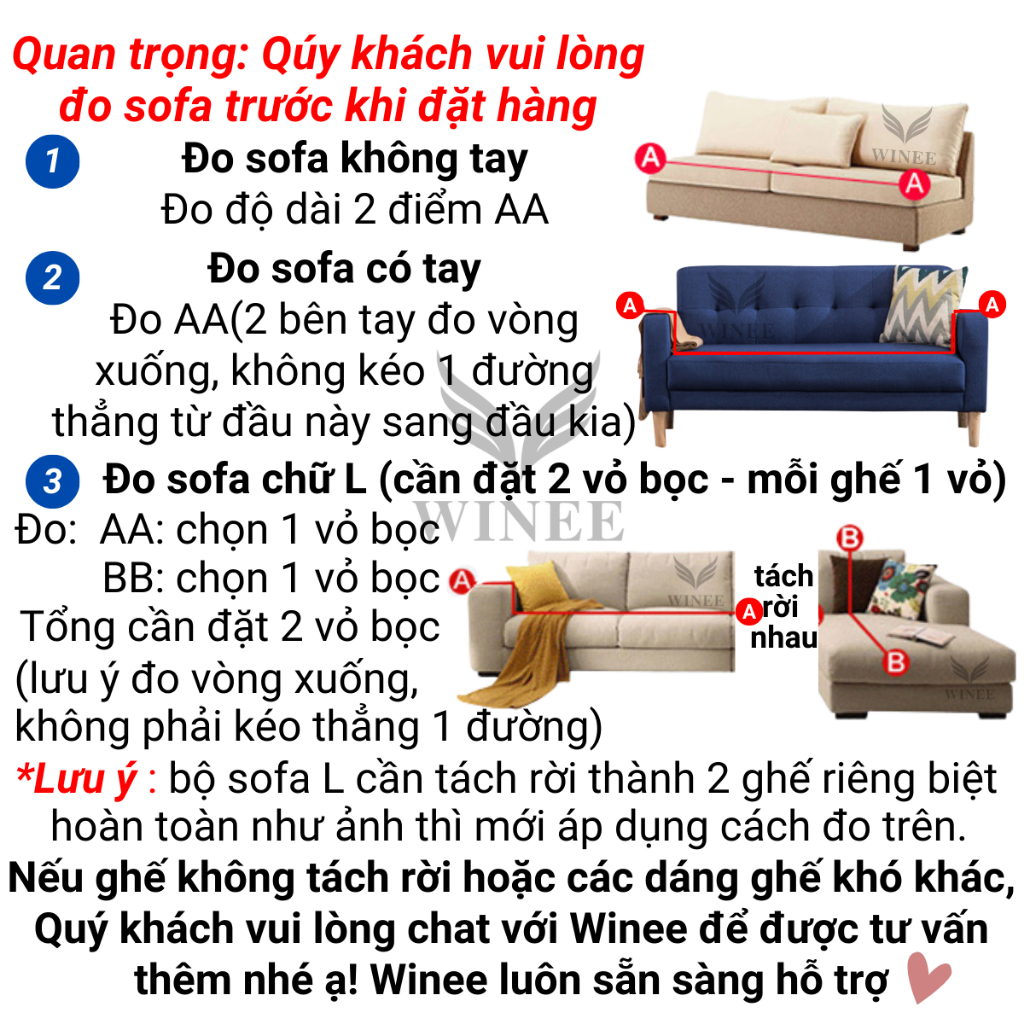 QUÝ KHÁCH VUI LÒNG INBOX CHO DULCETT ẢNH SOFA ĐỂ ĐƯỢC TƯ VẤN CỤ THỂ. SOFA CHỮ L CẦN ĐẶT 2 VỎ BỌC, MỖI GHẾ 1 VỎ SẢN PHẨM MAY SẴN NÊN CHỈ VỪA SOFA MỘT CÁCH TƯƠNG ĐỐI, QUÝ KHÁCH THEO CHỦ NGHĨA HOÀN HẢO VUI LÒNG CÂN NHẮC KHI ĐẶT HÀNG. Sofa màu tối hoặc màu chói nên chọn ga bọc màu sẫm hoặc đồng màu nếu là ga bọc vải thun mỏng để đỡ lộ màu sofa gốc. Ví dụ sofa màu đen không nên chọn ga bọc Be Breathe. Qúy khách vui lòng thử trước xem có vừa không rồi mới giặt. Nếu đã giặt, Winee xin phép từ chối đổi trả. Toàn bộ đều là ảnh chụp thật sản phẩm. Tuy nhiên do chụp ở studio với điều kiện ánh sáng tốt nên màu trên ảnh sẽ sáng hơn màu sản phẩm thật. DULCETT xin chân thành cảm ơn! Sản phẩm gồm: 1 vỏ bọc + thanh xốp + 1 giấy hướng dẫn bọc + tặng 1 vỏ gối. Chất liệu: vải thun sữa mỏng mịn mềm mại, thoải mái, co giãn, thích hợp 4 mùa Áp dụng quy tắc "THỪA HƠN THIẾU" khi chọn size: nếu Qúy khách đo sofa có kích thước 185cm nên chọn size L. Xin Qúy khách vui lòng lưu ý: Sản phẩm cũng như ga giường: trong quá trình sử dụng sẽ có sự xê dịch và xốp bị trồi ra, cần thao tác chỉnh lại một chút. Để hạn chế Qúy khách có thể tham khảo sản phẩm ghim sofa dành riêng cho sofa vải. DULCETT cam kết cung cấp cho Khách hàng: Sản phẩm đúng mẫu - đúng chất lượng - đúng giá. Với mọi lỗi kĩ thuật do nhà sản xuất: chúng tôi đổi-trả hoàn toàn miễn phí. WINEE - MANG TIỆN NGHI CHO NGÔI NHÀ CỦA BẠN Hotline: 0385.795.564 #bocsofa #bocghesofa #vobocsofa #vaibocsofa #gabocsofa #vosofa #boc #sofa #gasofa #drapsofa #tambocsofa #sopha #sofagiuong #ghesofa #sofakhongtay #vobocghesofa #bocghesofabed #bocsopha #bocsofachuL