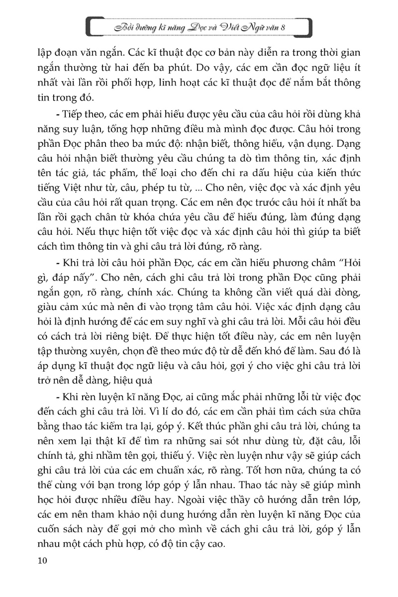 Cuốn sách “BỒI DƯỠNG KĨ NĂNG ĐỌC VÀ VIẾT NGỮ VĂN 8” sẽ giúp học sinh rèn luyện, phát triển kĩ nǎng Đọc, Viết, định hướng cách làm bài hiệu quả, phù hợp. Các em dễ tiếp cận, nắm được cách làm bài tập Đọc, Viết trong chương trình Ngữ vǎn lớp 8 mới, cải thiện, phát triển tư duy ngôn ngữ qua việc tự rèn luyện hai kĩ nǎng quan trọng (đọc, viết) khi học môn Ngữ vǎn. Thông qua mỗi đề luyện tập, học sinh có thể mở rộng vốn hiểu biết của bản thân về những vấn đề trong cuộc sống liên quan đến các chủ đề, bồi đắp tình yêu quê hương, đất nước nói chung, vǎn chương nói riêng đồng thời biết giữ gìn, phát huy giá trị của tiếng Việt đối với đời sống hiện nay. Cuốn sách “BỒI DƯỠNG KĨ NĂNG ĐỌC VÀ VIẾT NGỮ VĂN 8” còn là nguồn tài liệu bổ ích để các thầy cô có thể tham khảo, hướng dẫn học sinh rèn luyện kĩ nǎng Đọc và Viết thật hiệu quả.