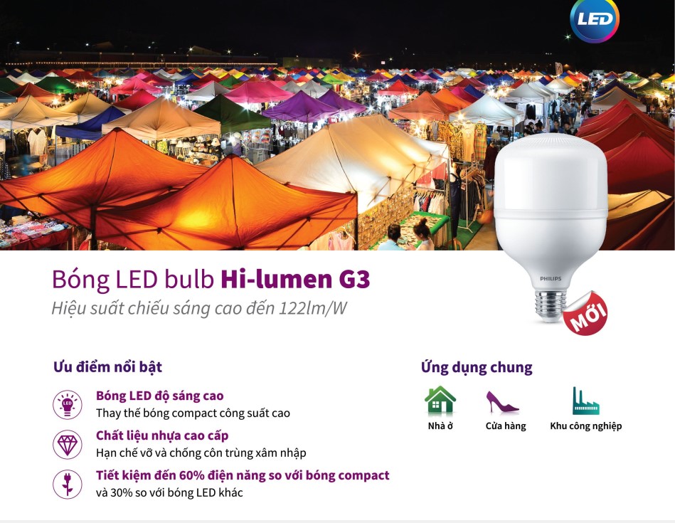 Công suất: 80W Điện áp: 220V/50-60Hz Quang thông: 8000lm/7400lm Nhiệt độ màu: 6500K/4000/3000K Chỉ số hoàn màu: 83 Kích thước (ØxH): (135 x 260) mm Bóng đèn LED Bulb LED TR135/80W.H Đặc tính của đèn: