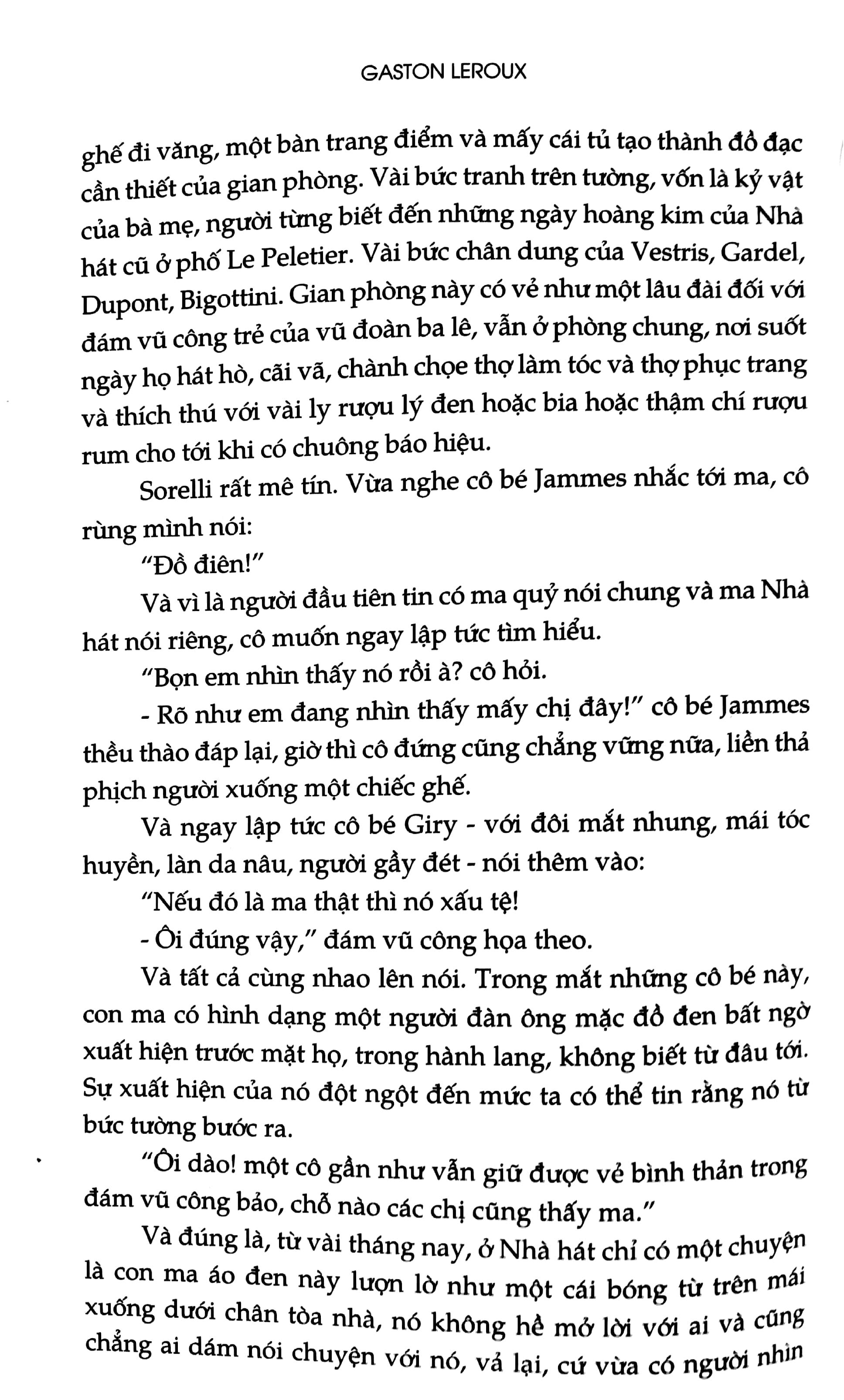 “Con ma Nhà hát đã tồn tại. Nó hoàn toàn không phải, như từ lâu người ta vẫn tin, một cảm hứng nghệ sĩ, thói mê tín của các đời giám đốc, trò sáng tạo vô vị từ những bộ óc quá khích của đám con gái trong vũ đoàn ba lê, của mẹ chúng, của các chị xếp chỗ, của những người làm trong phòng gửi đồ và của bà gác cổng.”