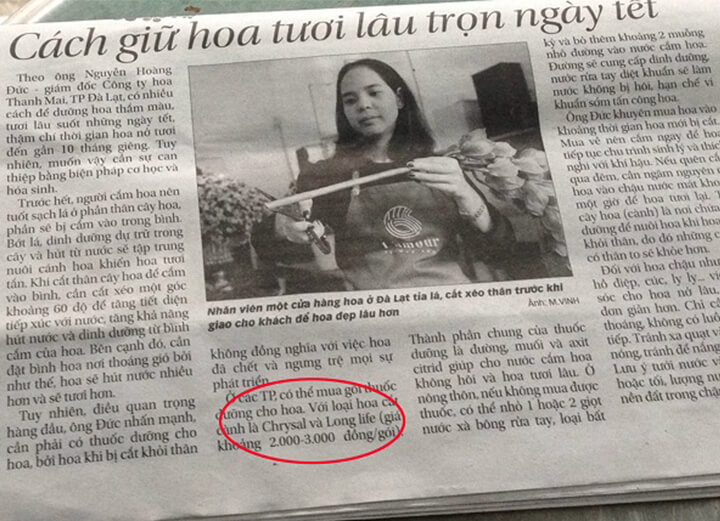 • Tuy nhiên, nếu có sử dụng chế phẩm dưỡng hoa tươi lâu Longlife thì Chủ shop KHÔNG PHẢI THAY HOA ĐỊNH KỲ NỮA. Hoa tươi đến ngày thứ 7 và như thế shop hoa sẽ tiết kiệm được rất nhiều chi phí về hoa và nhân công thay hoa