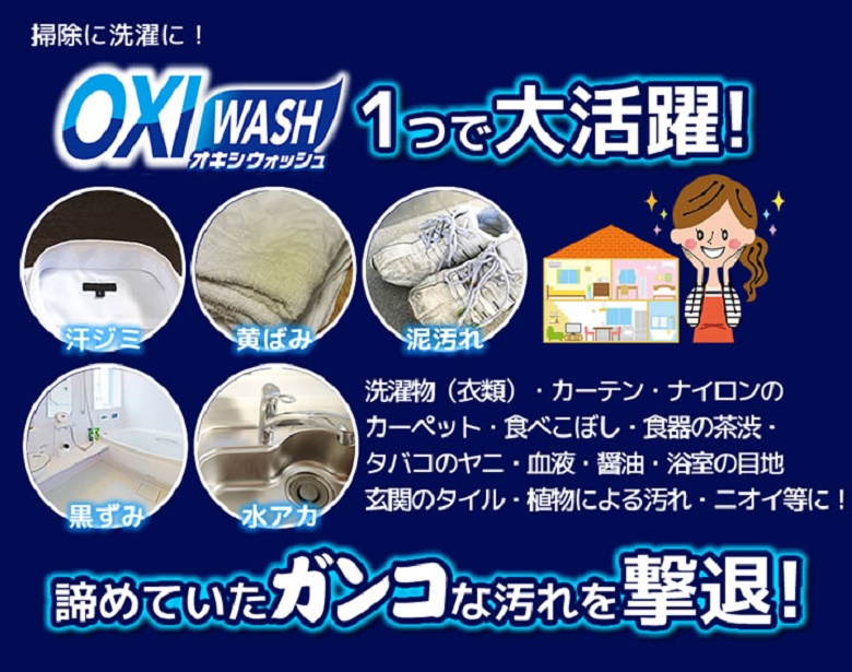 - Công dụng: OXI WASH sử dụng tẩy các vật dụng như cặn bình trà, vết cáu bẩn ở bát/ chén/ đĩa/ thìa/ muôi & những vết bẩn lưu bám trên giầy, tất, quần áo, rèm, bồn tắm, vết bám bẩn trên tường, sàn nhà, cửa, lồng máy giặt, bếp gas, bếp từ... v.v