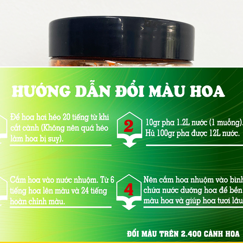 • Hủ 110gr pha được trên 12L nước giúp đổi được trên 2.400 cành hoa cắt cành (một muỗng 10gr pha 1L nước đến 1.2L nước)