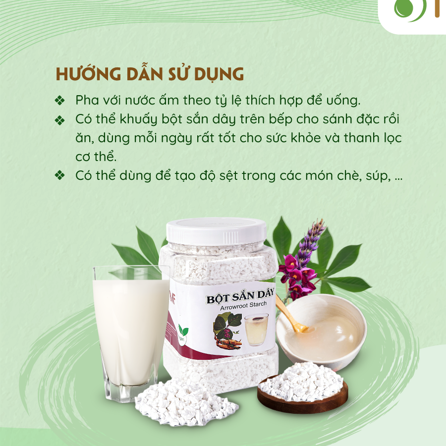 Hướng dẫn sử dụng bột sắn dây nguyên chất: pha bột sắn dây với nước ấm theo tỷ lệ thích hợp để uống. Ngoài ra có thể đun trên bếp, khuấy đều đến khi chín. Ngoài ra, bạn cũng có thể khuấy bột sắn dây trên bếp cho sánh đặc rồi ăn, dùng mỗi ngày rất tốt cho sức khỏe và thanh lọc cơ thể.