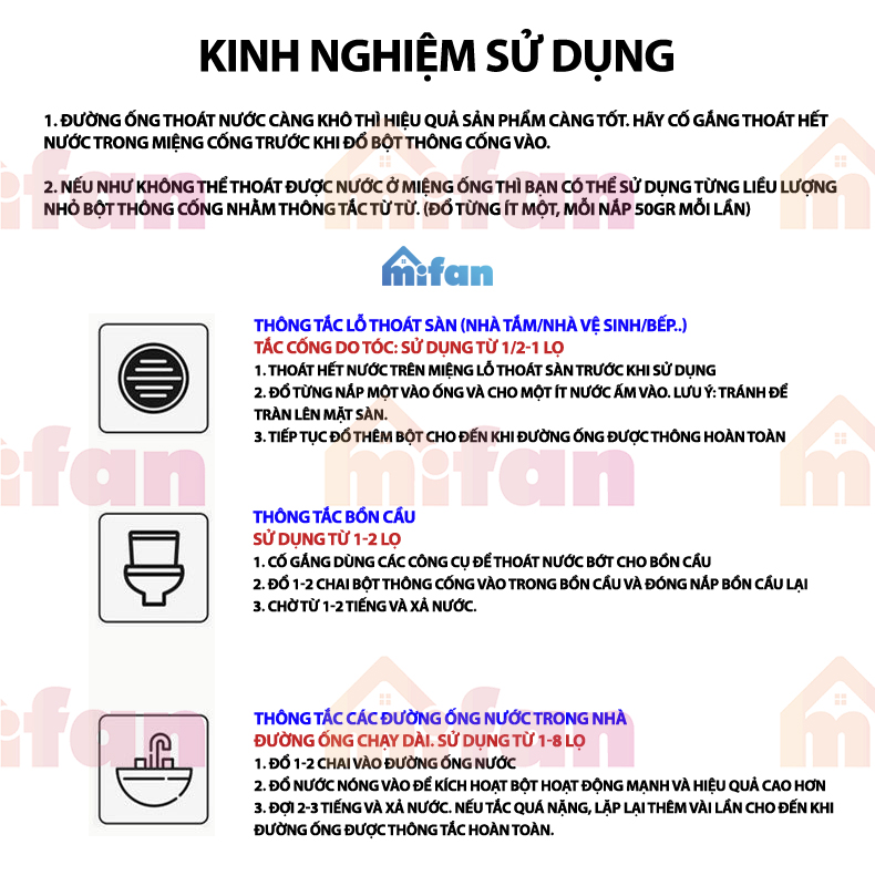 Không được pha bột với nước , chỉ đổ bột trực tiếp vào chỗ nghẹt, nếu lỗ nhỏ có thể gấp giấy thành dạng phễu để đổ, tránh bột không vào được chỗ nghẹt.