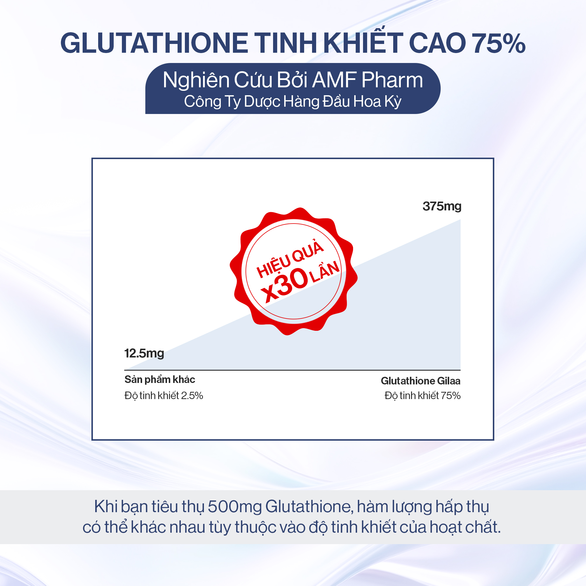 Bột ngậm trắng da Glutathione C Gilaa với công thức kết hợp các thành phần cao cấp Glutathione, Vitamin C, Elastin & Cà Chua Trắng giúp dưỡng trắng bật tông toàn thân hiệu quả nhanh & rõ rệt sau 28 ngày. Glutathione tinh khiết cao 75% nghiên cứu bởi công ty dược hàng đầu Hoa Kỳ AMF, mang lại hiệu suất dưỡng trắng cao & đảm bảo an toàn. Bột ngậm với công nghệ Melting hiện đại, hấp thụ trực tiếp qua niêm mạc miệng & tránh bị phân hủy bởi axit dạ dày.