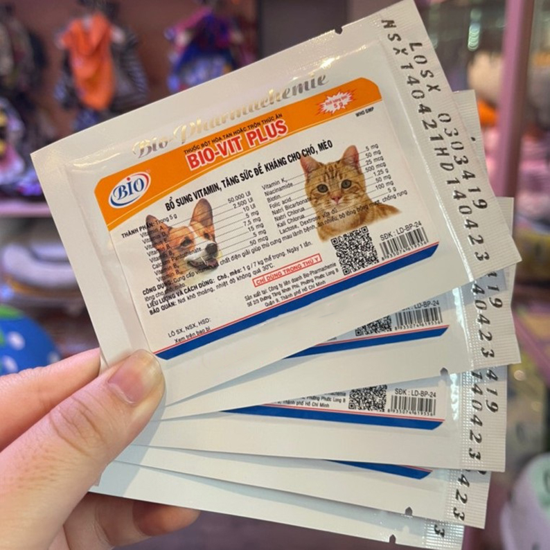 Mua tại TiktokBIO-VIT PLUS VITAMIN CAO CẤP TĂNG ĐỀ KHÁNG THÚ CƯNG THÀNH PHẦN: Vitamin A, D3, E, B1, B2, B6, B12, K3 Niacinamide Biotin Folic acid Natri Bicarbonate Natri Chlorua Kali Chlorrua Lactose, Dextrose vừa đủ