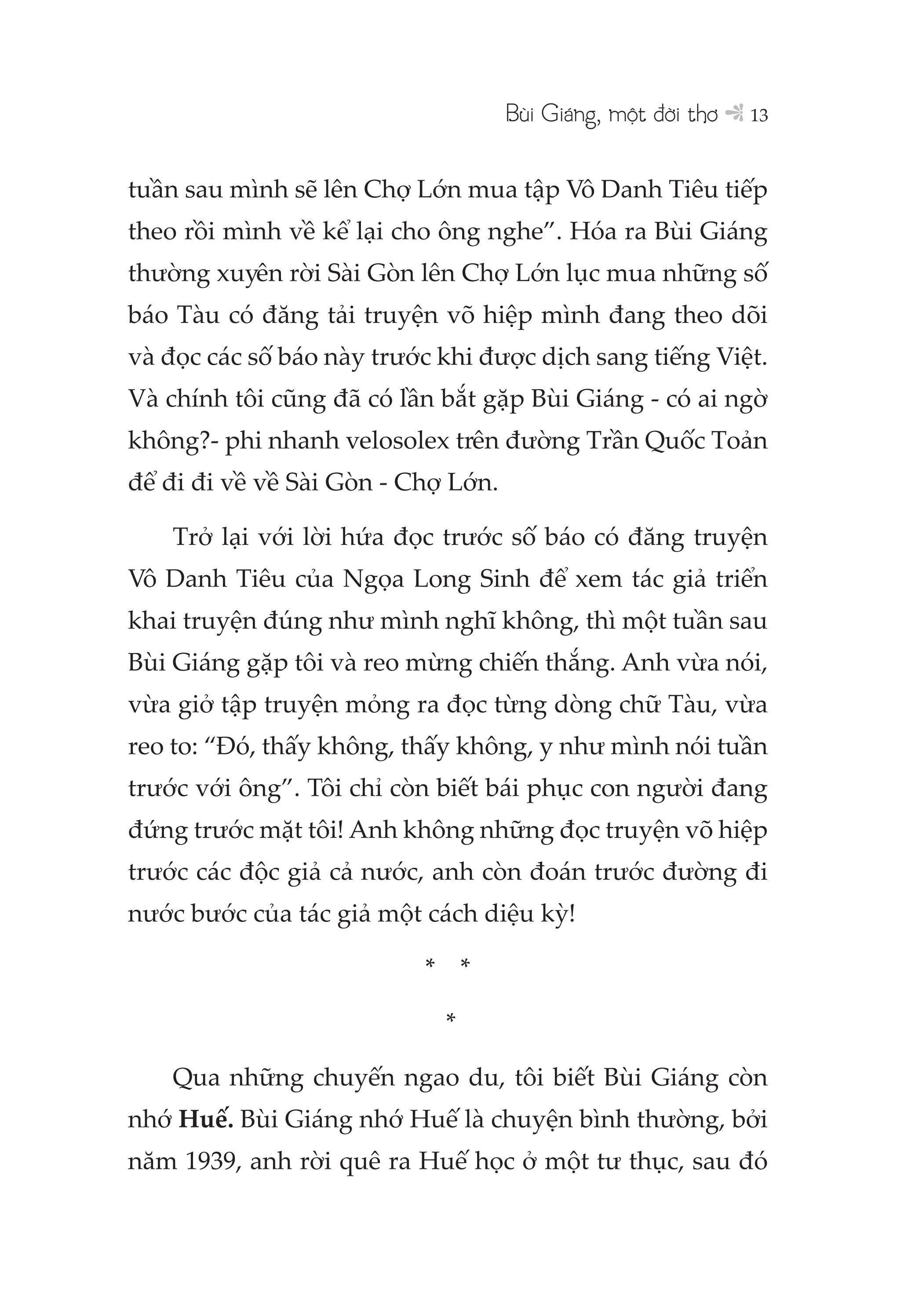 Đây là cuốn sách của nhà văn, dịch giả Bửu Ý, viết về Bùi Giáng, một giọng thơ vô tiền khoáng hậu của văn học Việt Nam thế kỷ XX. Dù viết bao nhiêu về Bùi Giáng, có lẽ cũng là không chính xác hoàn toàn vì ông đã trở thành một hiện tượng, một tượng đài ngôn ngữ, vậy mà qua ngòi bút của Bửu Ý, chúng ta không chỉ thấy Bùi Giáng mà còn thấy cả hơi thở, không khí thời đại mà hai người đã dự phần vào…