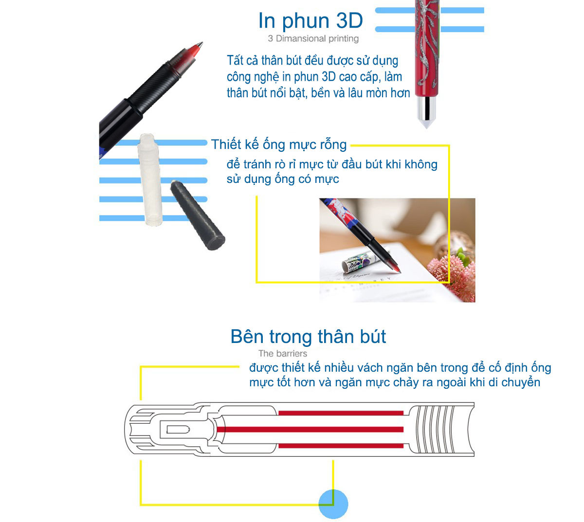 - Màu sắc :Vàng - Đặc điểm : +Thiết kế bút nhẹ, vừa tay cầm + Công nghệ mực Free Ink System giúp mực chảy đều, không bị lem mực, tạo nét viết êm trơn
