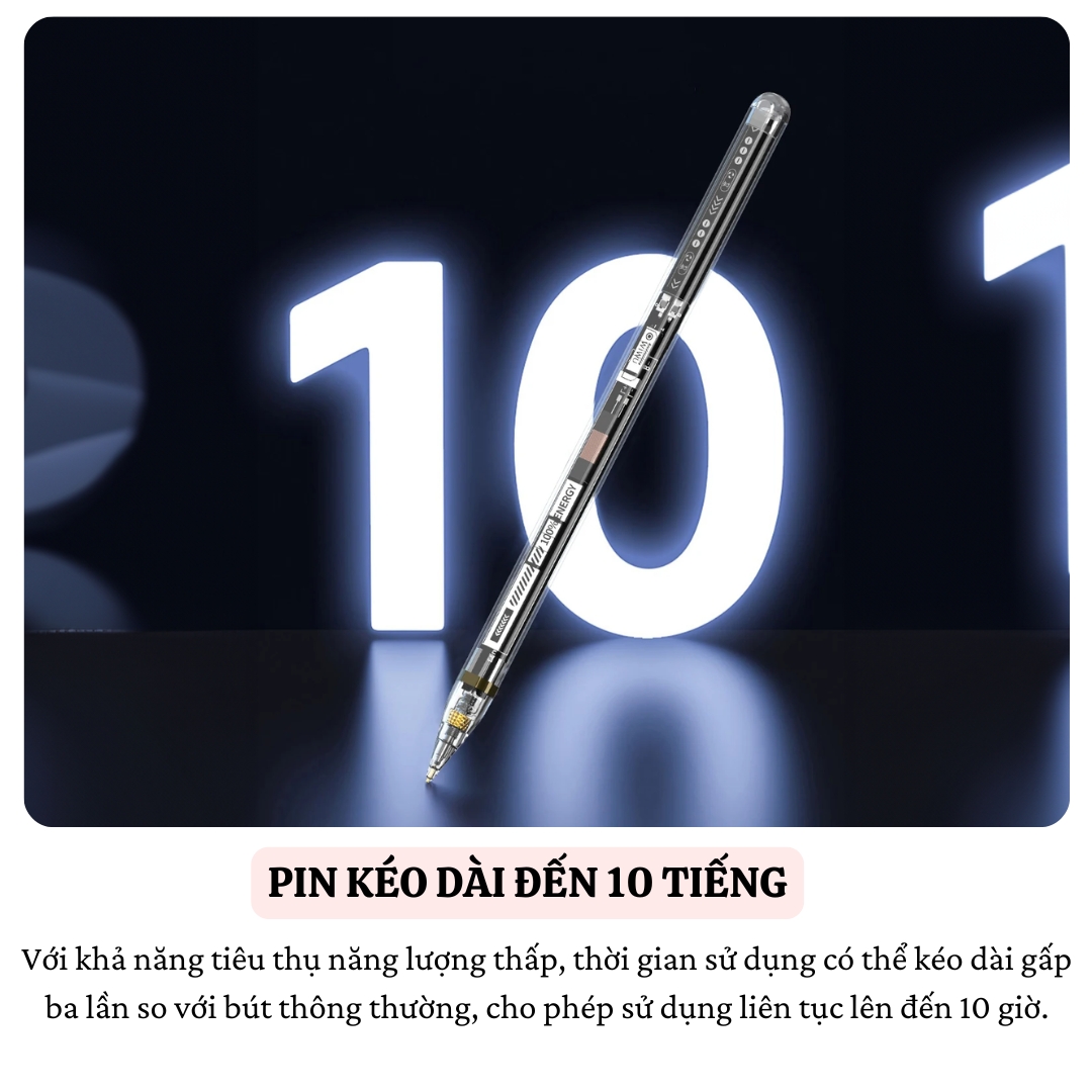 Với pin 100mAh, bút cung cấp tới 10 giờ sử dụng liên tục, đảm bảo bạn có thể làm việc mà không bị gián đoạn. Bên cạnh đó, thời gian chờ lên đến 90 ngày giúp bút luôn sẵn sàng khi cần.