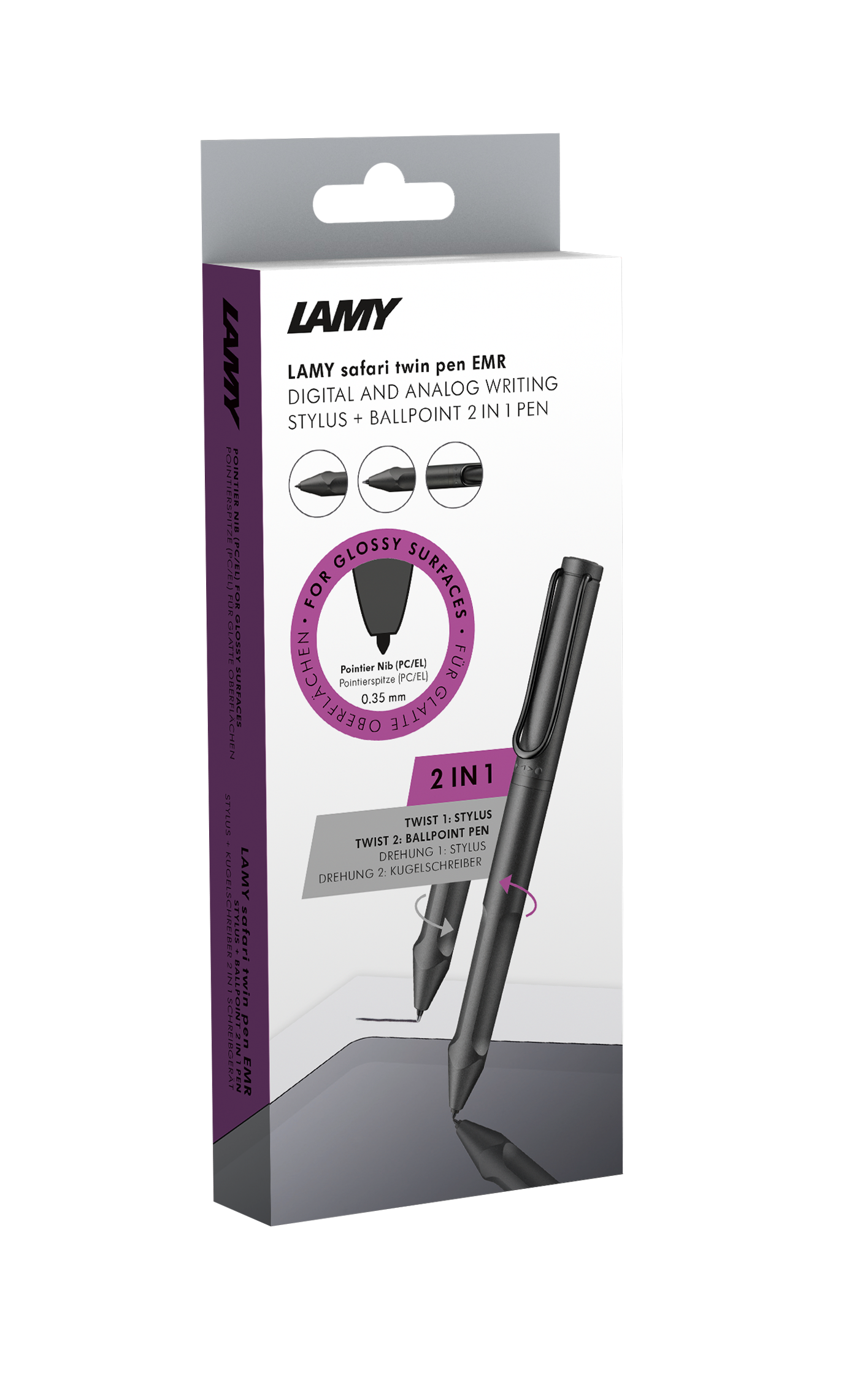 Dựa trên thiết kế LAMY safari twin pen, cây bút 2 trong 1 này được phát triển để sử dụng linh hoạt trên cả phương tiện kỹ thuật số (máy tính bảng, điện thoại thông minh, máy tính xách tay) và trên giấy. Bao gồm 1 ngòi bút điện tử và 1 ngòi bút bi giúp người dùng sử dụng linh hoạt hơn.