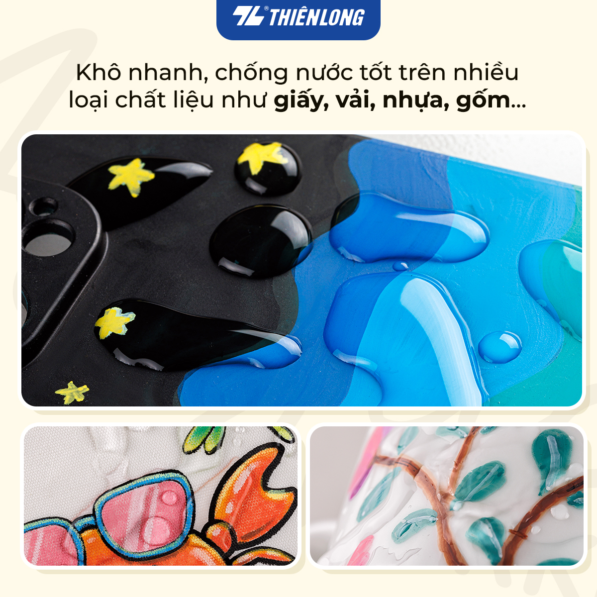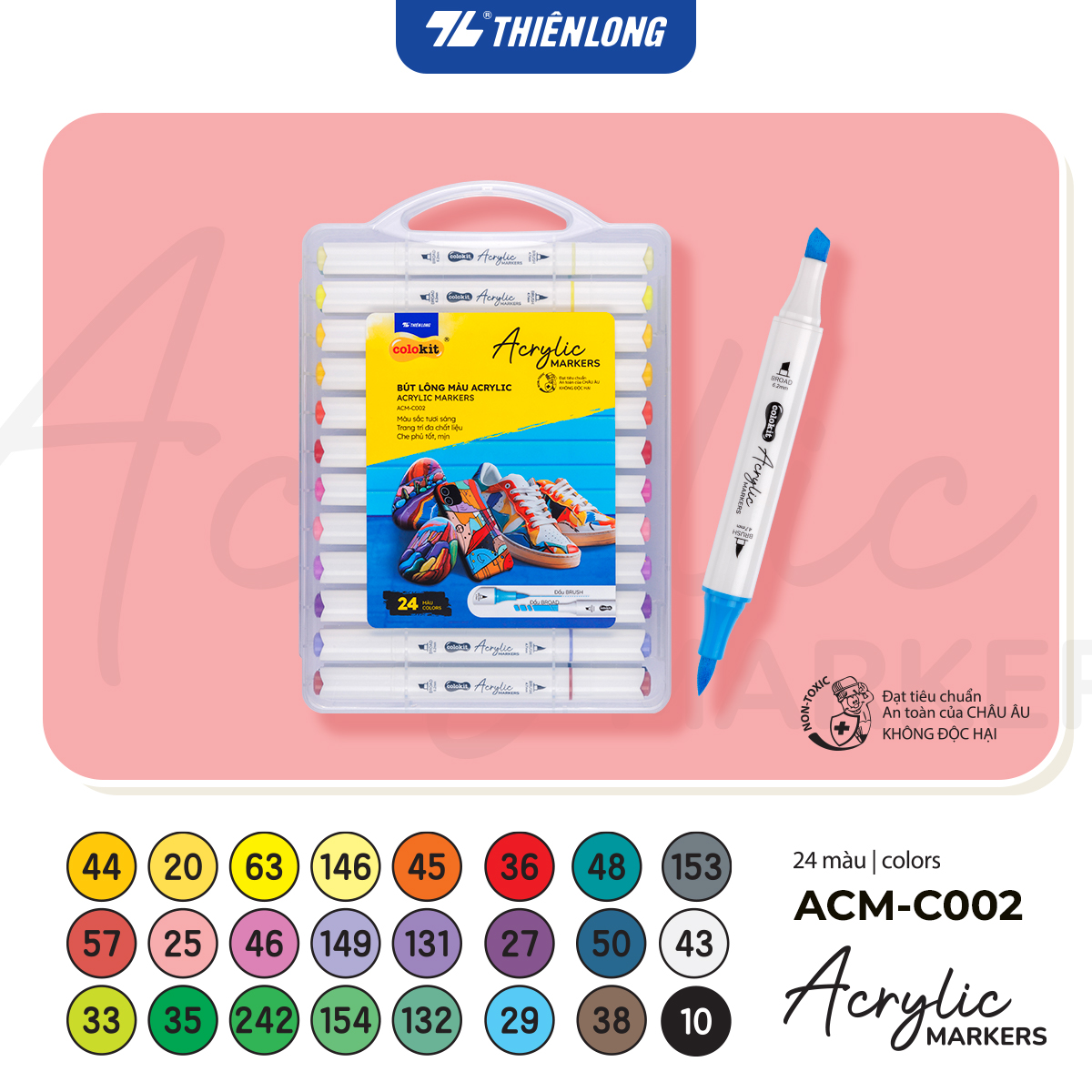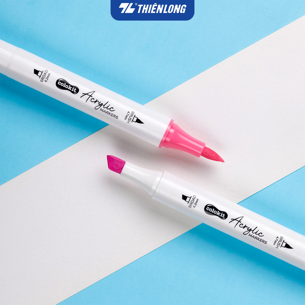- Bút lông màu Acrylic - Acrylic Markers Thiên Long Colokit, sử dụng được trên nhiều bề mặt: giấy vẽ chuyên dụng, gỗ, vải, sứ, thủy tinh và có khả năng bám dính tốt.