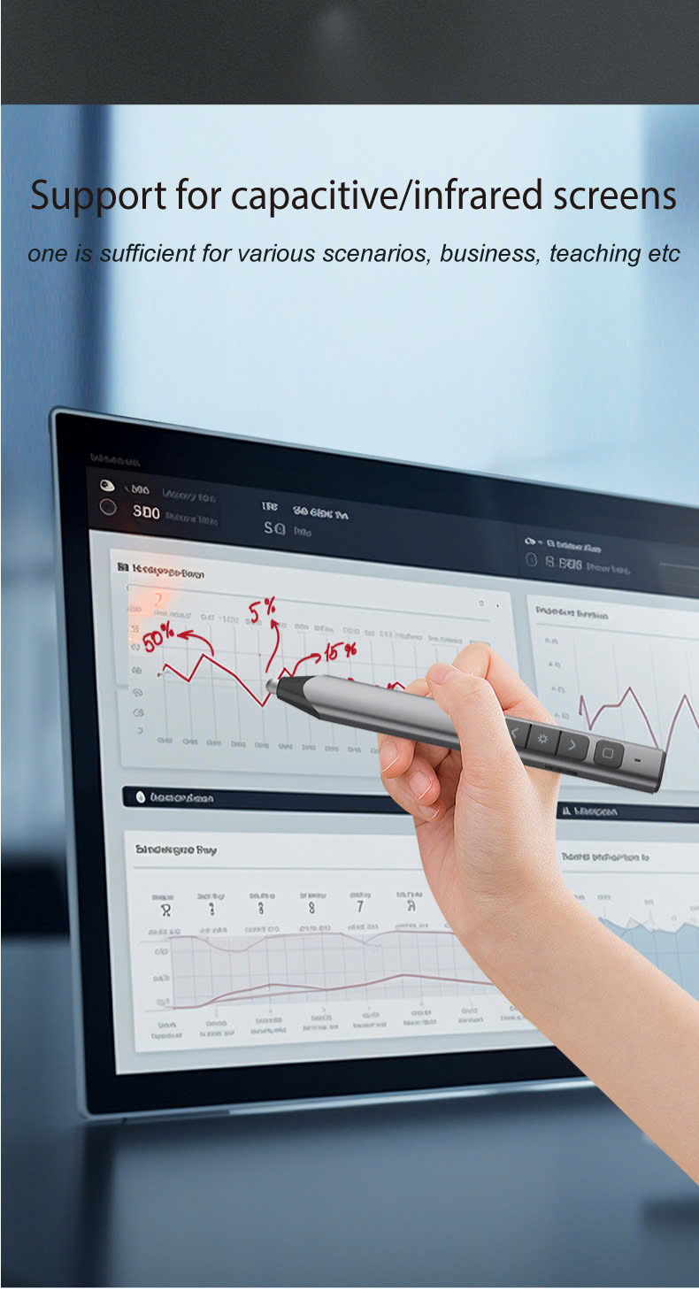 Chức năng hỗ trợ: Hỗ trợ các thao tác trình chiếu như điều khiển lên/xuống trang, phát/tạm dừng slide, chuyển đổi cửa sổ, hiển thị màn hình trống, sử dụng siêu liên kết. Ngoài ra còn có thể sử dụng như bút cảm ứng trên màn hình tương tác.