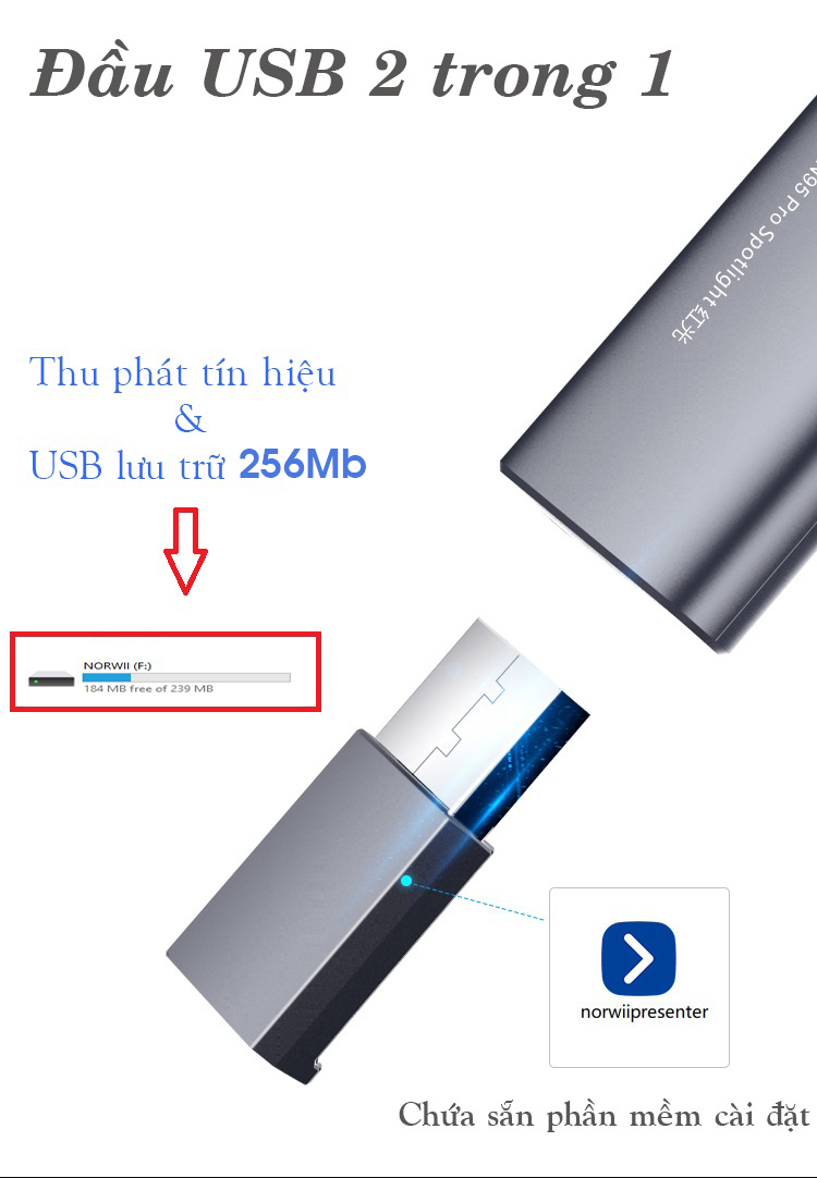 Bút trình chiếu NORWii N95 Pro Spotlight cao cấp 2in1 Thông số kỹ thuật : Model : NORWii N95 Pro SPOTLIGHT Kết nối : 2.4GHz Đầu USB 2in1 :thu phát Wireless 2.4Ghz và USB dung