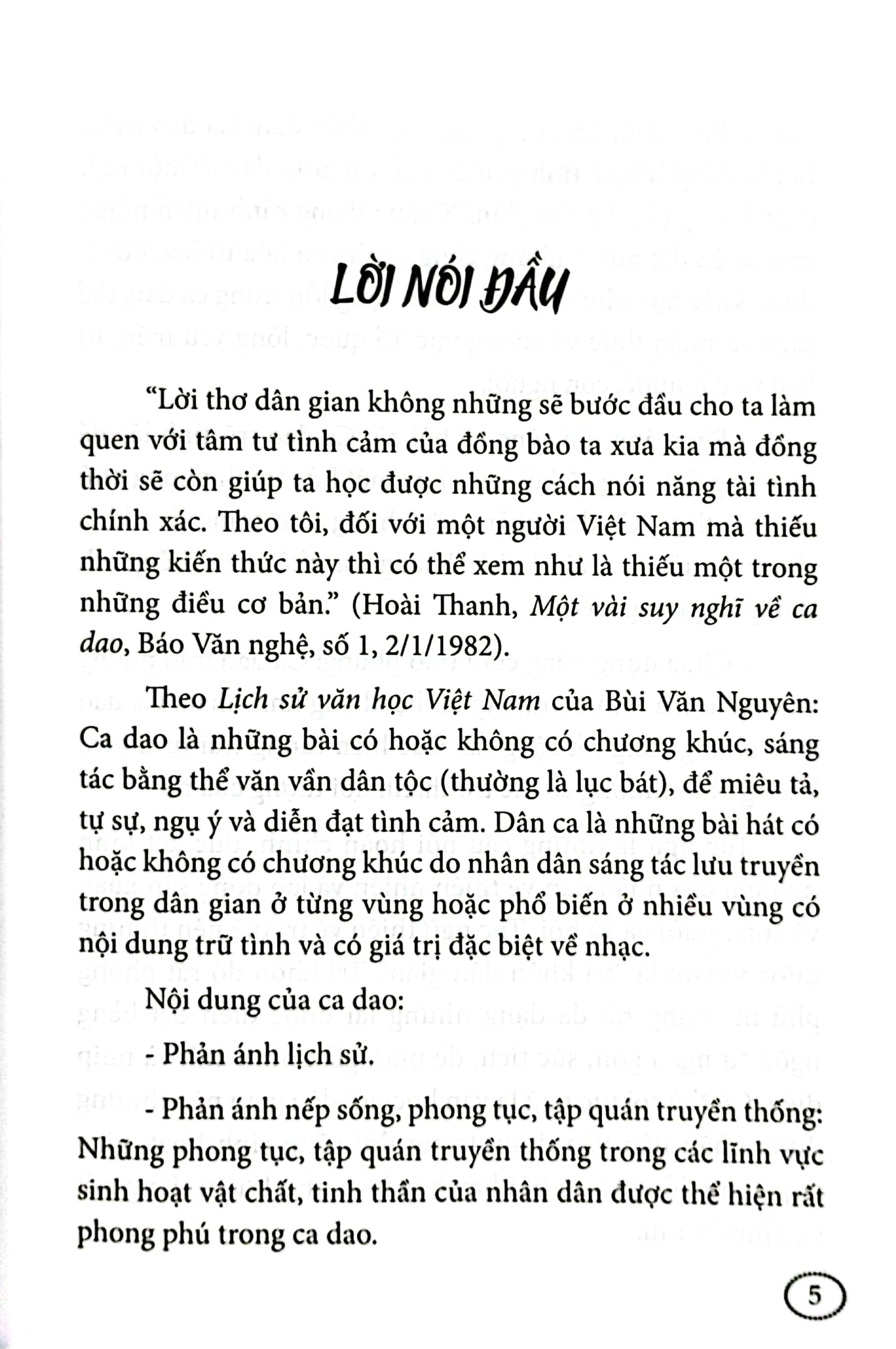 “Lời thơ dân gian không những sẽ bước đầu cho ta làm quen với tâm tư tình cảm của đồng bào ta xưa kia mà đồng thời sẽ còn giúp ta học được những cách nói năng tài tình chính xác. Theo tôi, đối với một người Việt Nam mà thiếu những kiến thức này thì có thể xem như là thiếu một trong những điều cơ bản.” (Hoài Thanh, Một vài suy nghĩ về ca dao, Báo Văn nghệ, số 1, 2/1/1982).