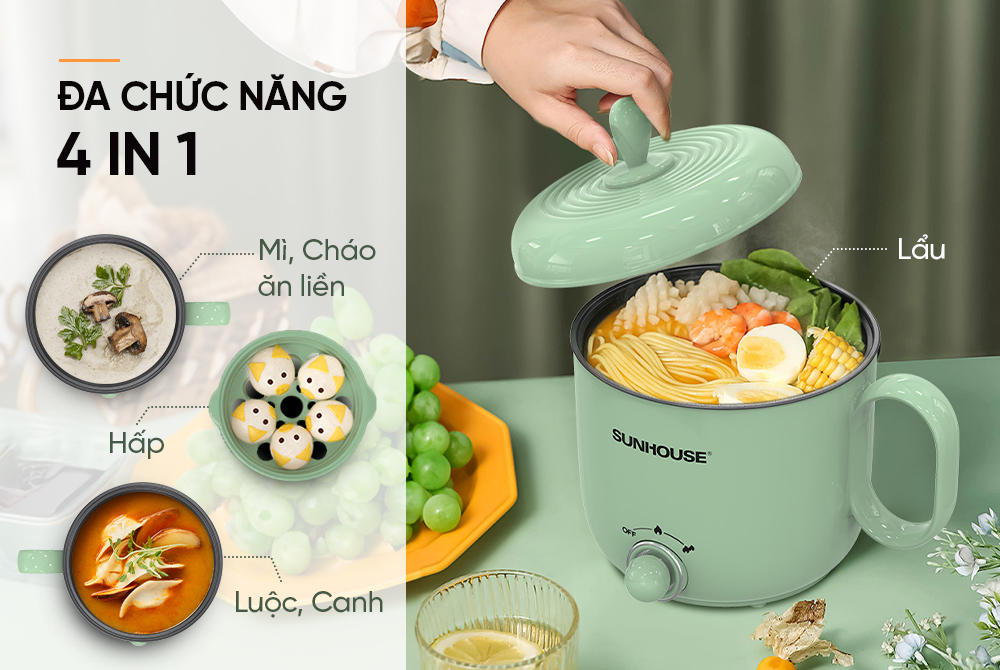 Ca lẩu điện Sunhouse SHD4515G là sản phẩm nhà bếp tiện lợi không chỉ giúp bạn nấu mì, lẩu mà còn các món khác như cháo, canh, súp, hấp ... Nổi bật với thiết kế