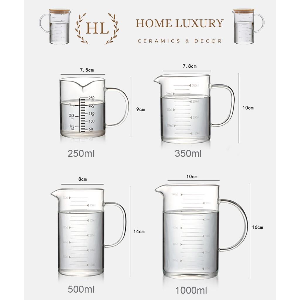 Chất liệu: thủy tinh cao cấp chịu lực chịu nhiệt Borosilicate Kích thước : + 250ml : 7.5cmx10cm + 350ml : 8.5cmx10cm + 500ml: 9cmx14cm + 1000ml: 11.5cmx17cm Ca đong thủy tinh kích cỡ khác
