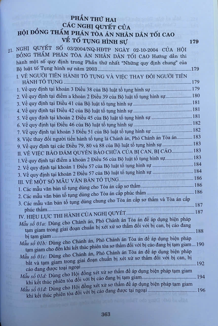 Nghị quyết của Hội đồng Thẩm phán Tòa án nhân dân tối cao được ban hành để hướng dẫn các Tòa án áp dụng thống nhất pháp luật. Thời gian qua, Hội đồng Thẩm phán Tòa án nhân dân tối cao đã thông qua nhiều Nghị quyết về hình sự và tố tụng hình sự.  Nhằm kịp thời thông tin đầy đủ, chính xác và có hệ thống các Nghị quyết của Tòa án nhân dân tối cao về hình sự và tố tụng hình sự, Nhà xuất bản Thông tin và Truyền thông  cho xuất bản và phát hành cuốn sách: Các Nghị Quyết Của Hội Đồng Thẩm Phán Tòa Án Nhân Dân Tối Cao Về Hình Sự Và Tố Tụng Hình Sự Từ Năm 1986 Đến Năm 2024 (Dành Cho Thẩm Phán, Thẩm Tra Viên, Hội Thẩm, Kiểm Sát Viên, Luật Sư Và Các Học Viên Tư Pháp). Nội dung cuốn sách gồm các phần chính sau đây: Phần thứ nhất. Hệ thống các Nghị quyết của Hội đồng Thẩm phán Tòa án nhân dân tối cao về hình sự. Phần thứ hai. Hệ thống các Nghị quyết của Hội đồng Thẩm phán Tòa án nhân dân tối cao về tố tụng hình sự  Sự ra đời của cuốn sách đã đánh dấu bước tiến quan trọng trong việc hệ thống hóa và cung cấp nguồn tư liệu pháp luật đầy đủ, chính thống về các Nghị quyết của Hội đồng Thẩm phán Tòa án nhân dân tối cao liên quan đến lĩnh vực hình sự và tố tụng hình sự. Đây là tài liệu vô cùng thiết thực và cần thiết cho hoạt động xét xử, góp phần đảm bảo tính công bằng, khách quan và đúng pháp luật.