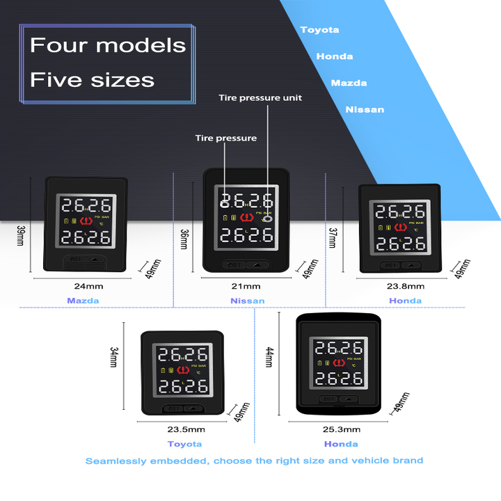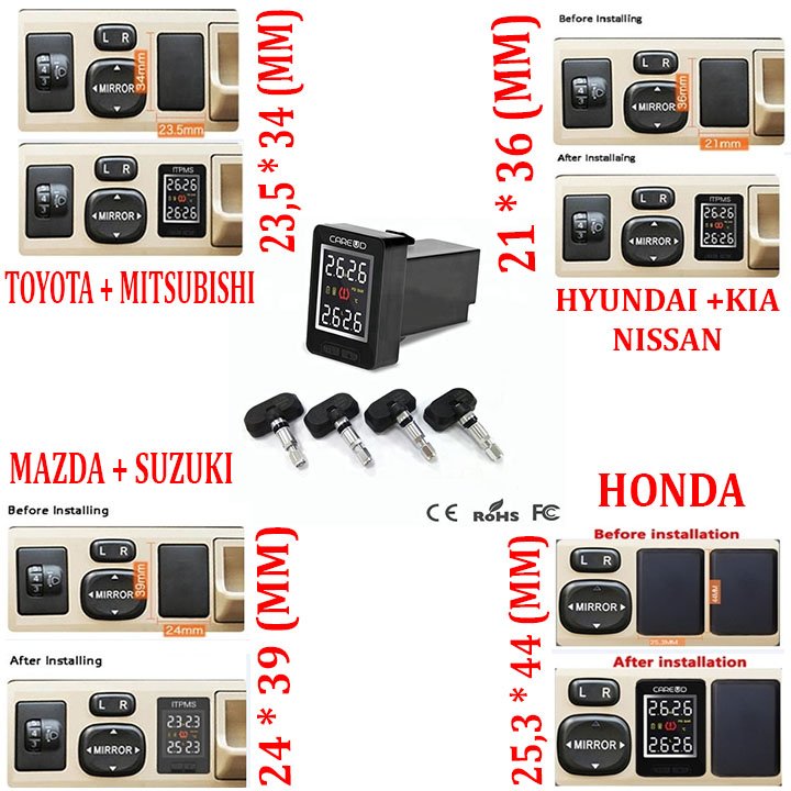 - LƯU Ý: Trước khi đặt hàng, khách hàng cần đo kích thước lỗ đặt cảm biến áp suất lốp xem đã khớp xe của mình chưa: - TOYOTA, MITSUBISHI: 23,5MM 34MM - NISSAN, KIA, HYUNDAI: 21MM 36MM - MAZDA, SUZUKI: 24MM * 39MM