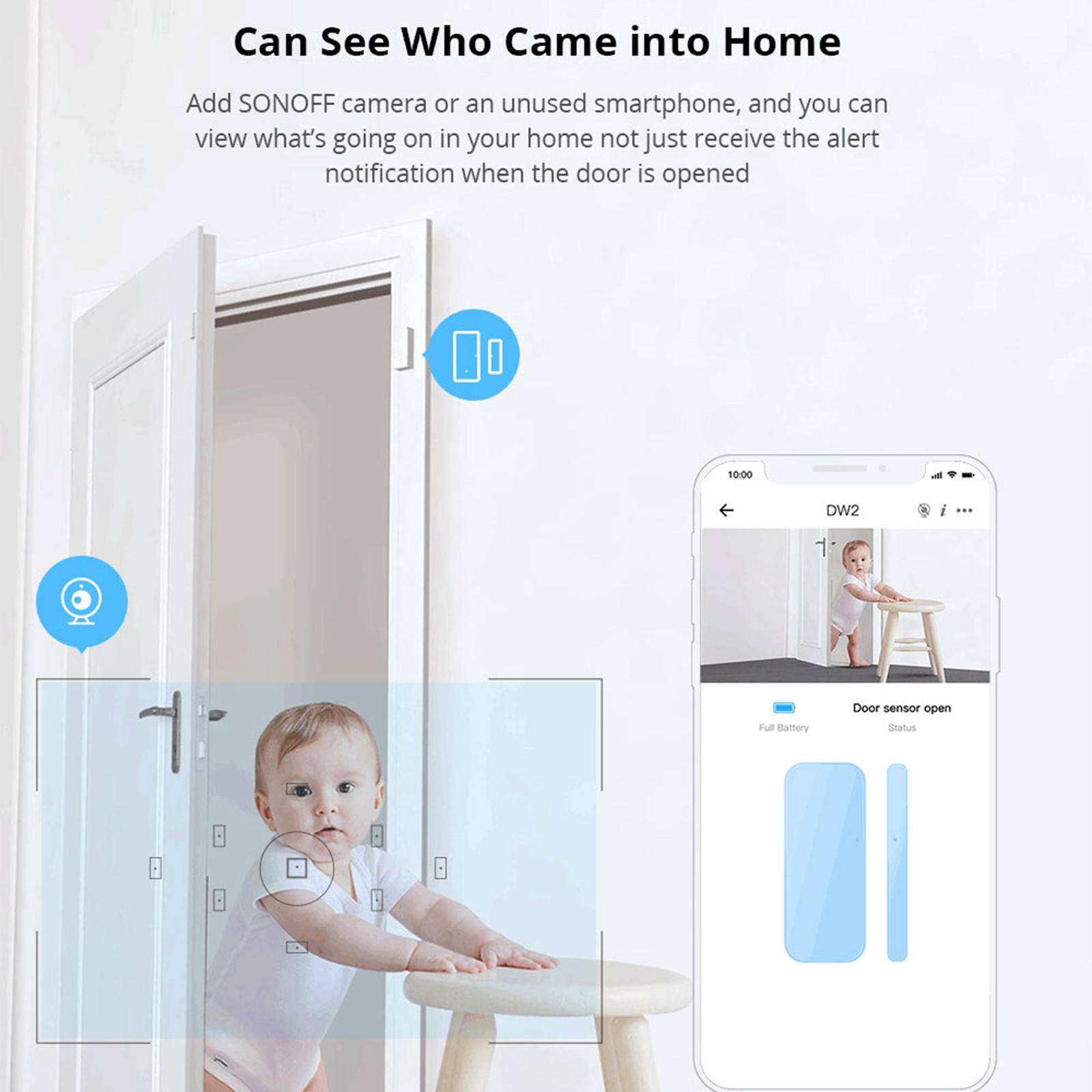 • Can See Who Come into Home: Add SONOFF Camera or an unused smartphone, and you can view what's going on in your home not just receive the alert notification when the door is open.