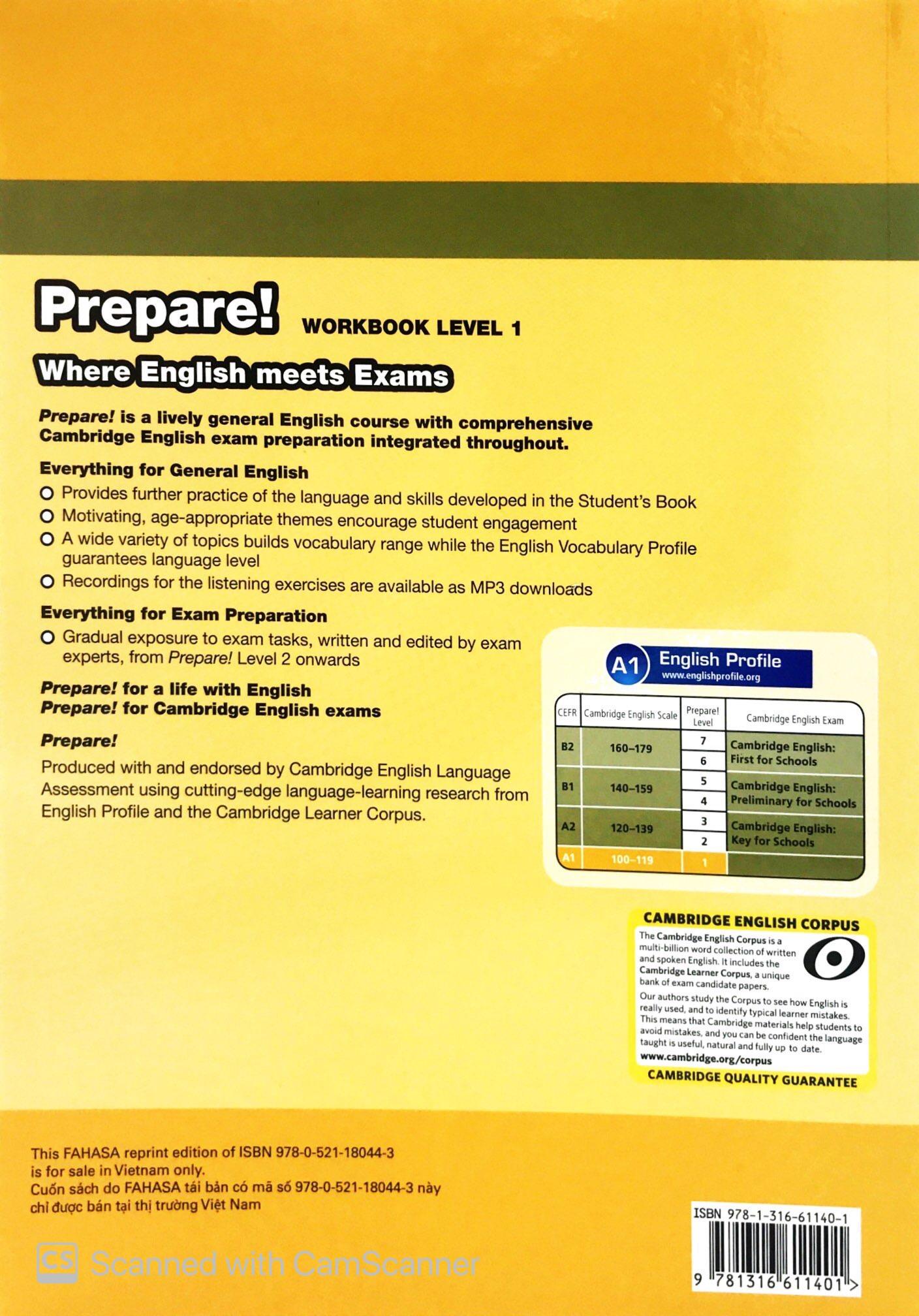 Cambridge English Prepare! 7 cấp độ dành cho thiếu niên Trình độ từ cơ bản đến cao trung cấp Prepare! là bộ giáo trình tiếng Anh tổng quát sinh động tích hợp luyện thi Cambridge English (KET, PET, FCE) trong suốt quá trình học. Chương trình học linh hoạt kết hợp với các phần mềm đa phương tiện giúp học sinh đạt kết quả như mong muốn. Dù áp dụng cho chương trình tiếng Anh tổng quát hay tập trung luyện thi Cambridge, Prepare! vẫn giúp giáo viên và học sinh hoàn toàn sẵn sàng cho hành trình tiếp theo: kỳ thi Cambridge hoặc giao tiếp trong thực tế. Prepare! bao gồm tất cả những gì cần cho tiếng Anh tổng quát và cả kỳ thi Cambridge Prepare! is a lively 7-level general English course with comprehensive Cambridge English for Schools exam preparation integrated throughout. This flexible course brings together all the tools and technology you expect to get the results you need. Whether teaching general English or focusing on exams, Prepare! leaves you and your students genuinely ready for what comes next: real Cambridge English exams, or real life. The Level 4 Student's Book engages students and builds vocabulary range with motivating, age-appropriate topics. Its unique approach is driven by cutting-edge language research from English Profile and the Cambridge Learner Corpus. 'Prepare ' sections develop writing and speaking skills. A Student's Book and Online Workbook is also available, separately .