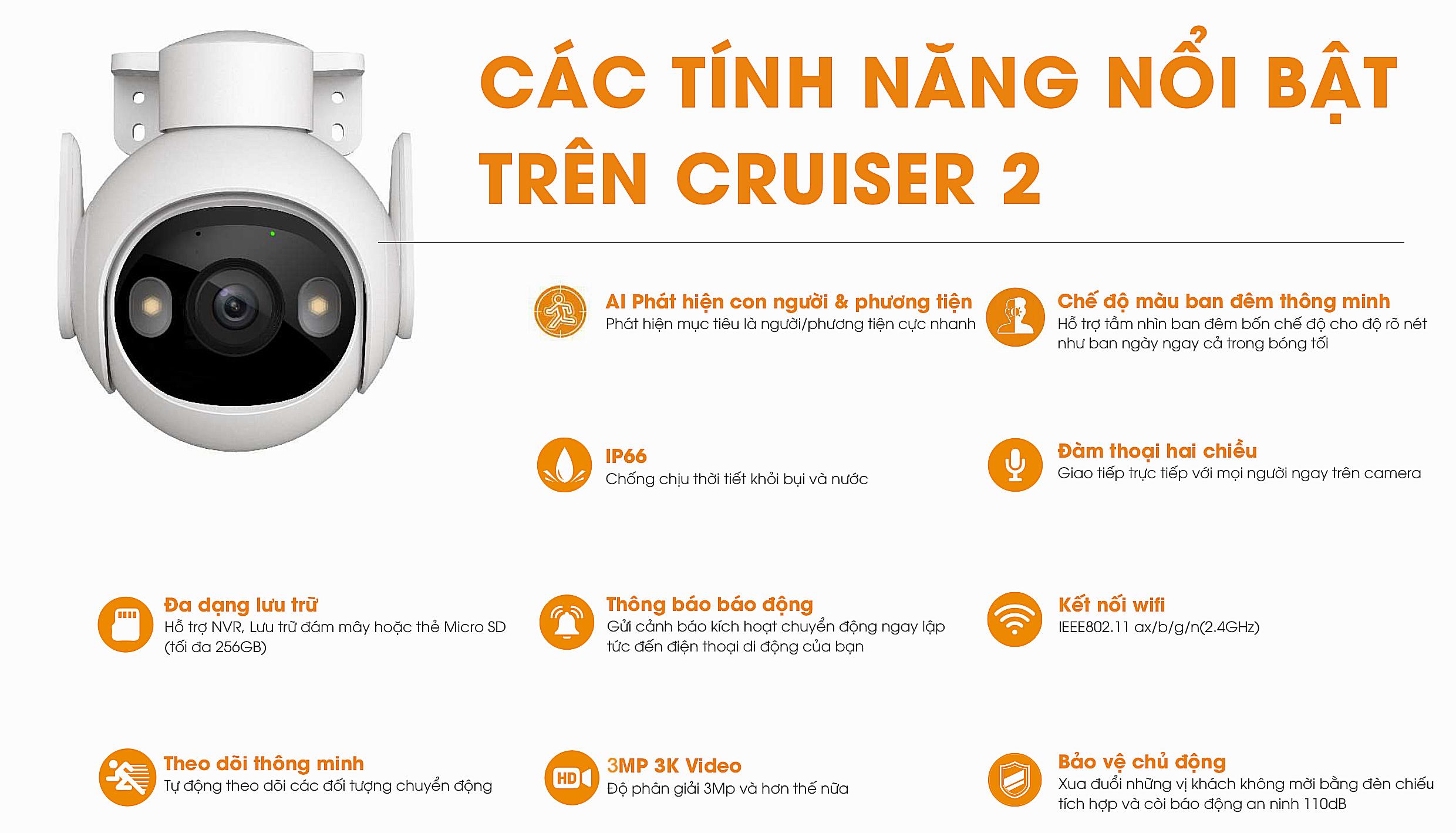 – Cảnh báo chủ động: bật đèn và hú còi (110dB) khi phát hiện có đối tượng xâm nhập.