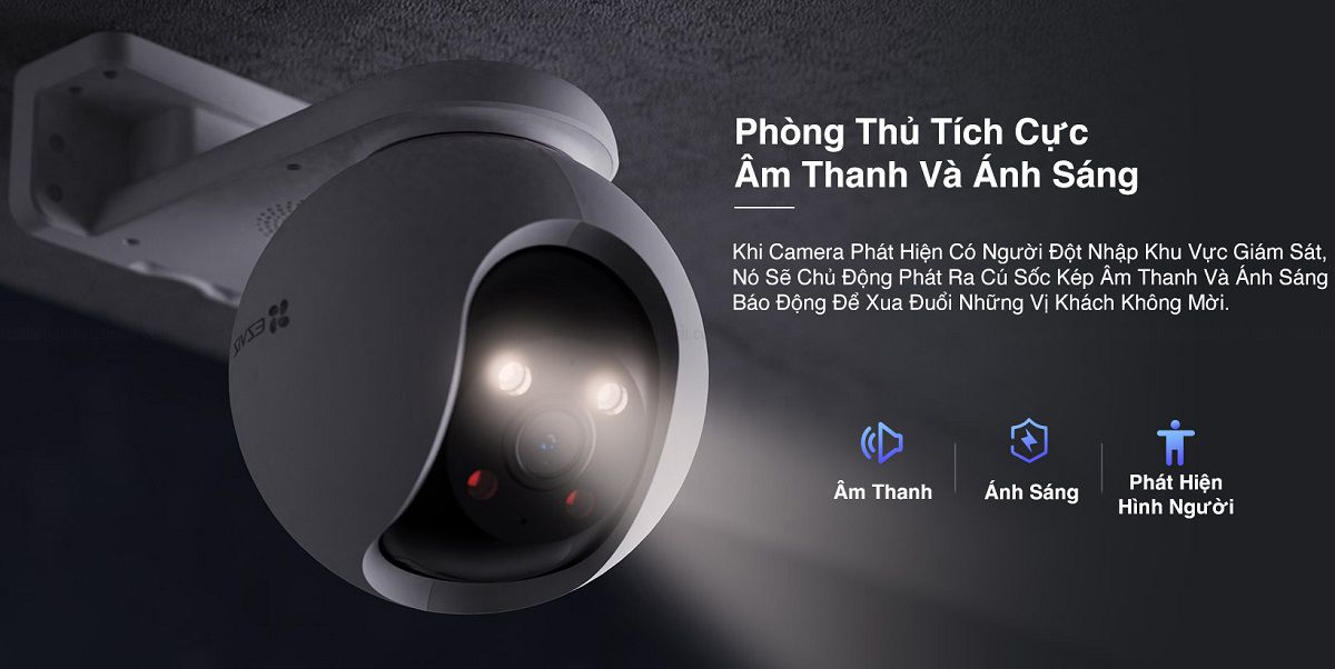 Camera được trang bị tính năng phòng vệ chủ động để cung cấp thêm một lớp bảo vệ vững chắc. Khi phát hiện ra những kẻ đột nhập, camera sẽ kích hoạt còi báo động lớn và nháy hai đèn chiếu sáng chói³ để những vị khách không mời rời đi.