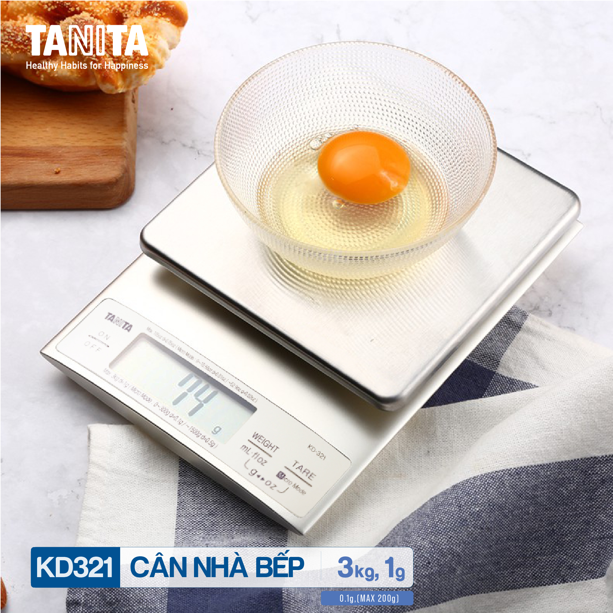 Một chiếc cân nhà bếp có thể tạo ra tất cả sự khác biệt trong việc nấu ăn và chuẩn bị thực phẩm của bạn. Mặc dù việc sử dụng các loại công cụ đo kiểu cũ như sử dụng ống bơ, bát, ché..cũng có thể chấp nhận được. Tuy nhiên, những phương pháp đo trên tốn nhiều công sức, đôi khi chưa chắc đã chính xác. Để việc cân đong, đo đếm thuận tiện và chính xác không tốn thời gian và công sức thì bạn nên sử dụng phương pháp đo theo trọng lượng bằng cân nhà bếp điện tử CÂN TIỂU LY ĐIỆN TỬ THỰC PHẨM TANITA KD321 CHÍNH HÃNG NHẬT BẢN  Sản phẩm cao cấp đến từ TANITA, thương hiệu hàng đầu NHẬT BẢN về cơ khí điện tử chính xác. Với uy tín trên thị trường TANITA đã và đang cung cấp hàng ngàn sản phẩm không chỉ vô cùng chính xác hiện đại mà lại rất bền bỉ và chắc chắc. Cân nhà bếp hiện nay được ứng dụng rất rộng rãi trong rất nhiều ngành nghề, nhất là ăn uống: Tiệm bánh, Tiệm cà phê, Cửa hàng hải sản, Thương nhân buôn bán yến xào, Nhà hàng, Bếp ăn gia đình.   ️ TÍNH NĂNG   Cân nhỏ gọn TỐI ĐA 3KG, TỐI THIỂU 0.1g (chế độ micro mode)  Thiết kế màu bạc sang trọng, phù hợp với mọi không gian bếp  Cân nhỏ gọn dễ mang vác  Sử dụng pin AA phổ biến  Cách sử dụng đơn giản thông qua vài phím bấm  Chế độ TARE tự trừ bì tiện lợi  Đĩa cân bằng thép không gỉ có khả năng chịu nhiệt độ cao và có thể tháo rời để dễ dàng để lau chùi.  Chế độ micromode cho phép chuyển đổi đơn vị tối thiểu từ 0g sang 0.0g  Dễ dàng chuyển đổi từ “g” sang “ml", CÓ THỂ CÂN ĐO CHẤT LỎNG   ️ THÔNG SỐ KỸ THUẬT   Cân tối đa: 3kg (3000g)  Khoảng chia: 1g  Micro mode: 0.1g (0g ~ 300g) ️️️  Màn hình: 68mm  Nguồn: 2 pin AA  Kích thước: 210 x 150 x 35 mm  Trọng lượng: 573g  Công ty sản xuất: Dongguan TANITA Health Equipment Co., Ltd  Địa chỉ: Dongguan City, Guangdong Provice, 523080, P.R.China   ️ HƯỚNG DẪN SỬ DỤNG  Bước 1: Lật mặt sau của cân, rút dải phim đen tiếp xúc giữa PIN và CHÂN TIẾP XÚC  Bước 2: Bật nút ON/OFF để khởi động cân, đợi cân hiển thị 0g  Bước 3: Đặt vật lên cân, ấn nút TARE (trừ bì) sau đó đặt thêm 1 vật khác lên cân   ️ Chế độ đặc biệt: TARE/Micro Mode có thể chuyển đổi khoảng chia 0.0g và 0g (tối đa 300g) ️ Chế độ đặt biệt: G/ml chuyển đổi giữa 2 đơn vị đo là g và ml (đo chất lỏng)