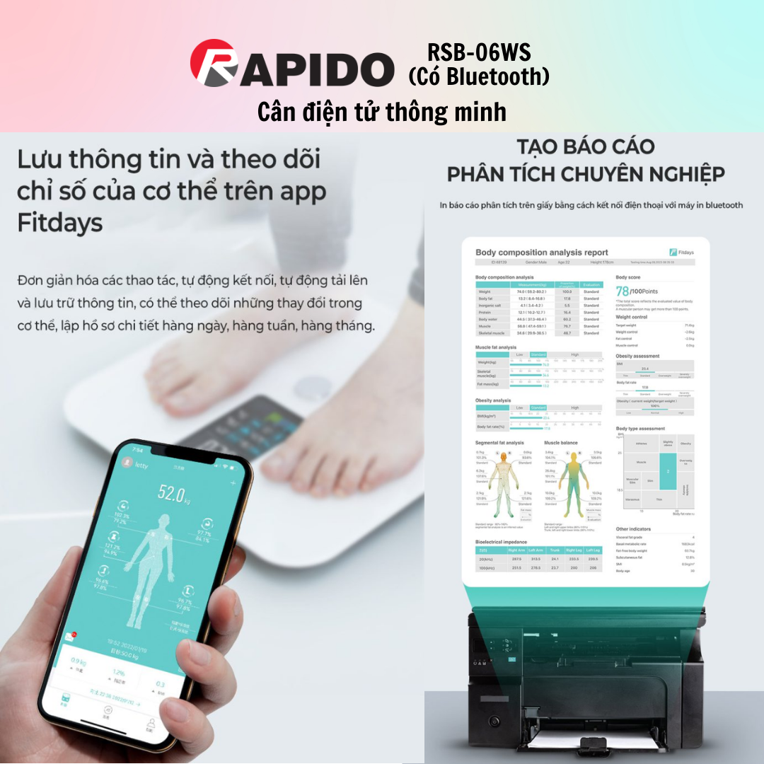 Mua tại TiktokƯU ĐIỂM NỔI BẬT: - Công nghệ đo BIA tần số kép 8 điện cực - Đo chính xác 25 chỉ số cơ thể - Tạo báo cáo phân tích body chuyên nghiệp - Màn LCD lớn, hiển thị trực quan rõ ràng - Kết nối app Fitdays, theo dõi và quản lý định hình cơ thể - Kính cường lực phủ ITO toàn mặt kính - Thiết kế cân bằng tối ưu, chống lật, chống trượt - Bộ nhớ lưu trữ số liệu tối đa 24 người THÔNG SỐ KỸ THUẬT: - Thương hiệu: Rapido - Tên sản phẩm: Cân sức khỏe thông minh - Model: Rapido RSB-09WS - Kích thước: 30 x 30 x 2.75 cm - Màn hình; 10.7 x 6.2 cm - Cân tối đa: 180kg/400lb - Pin Lithium 300mAh - Nguồn sạc Type-C Sport