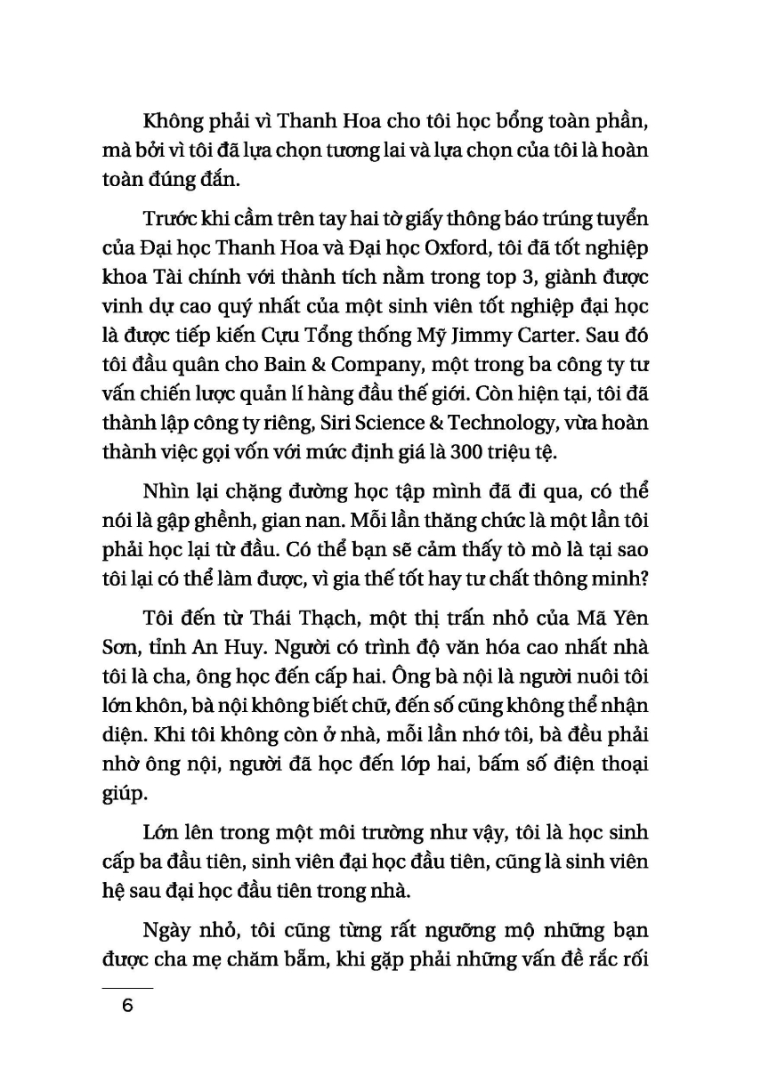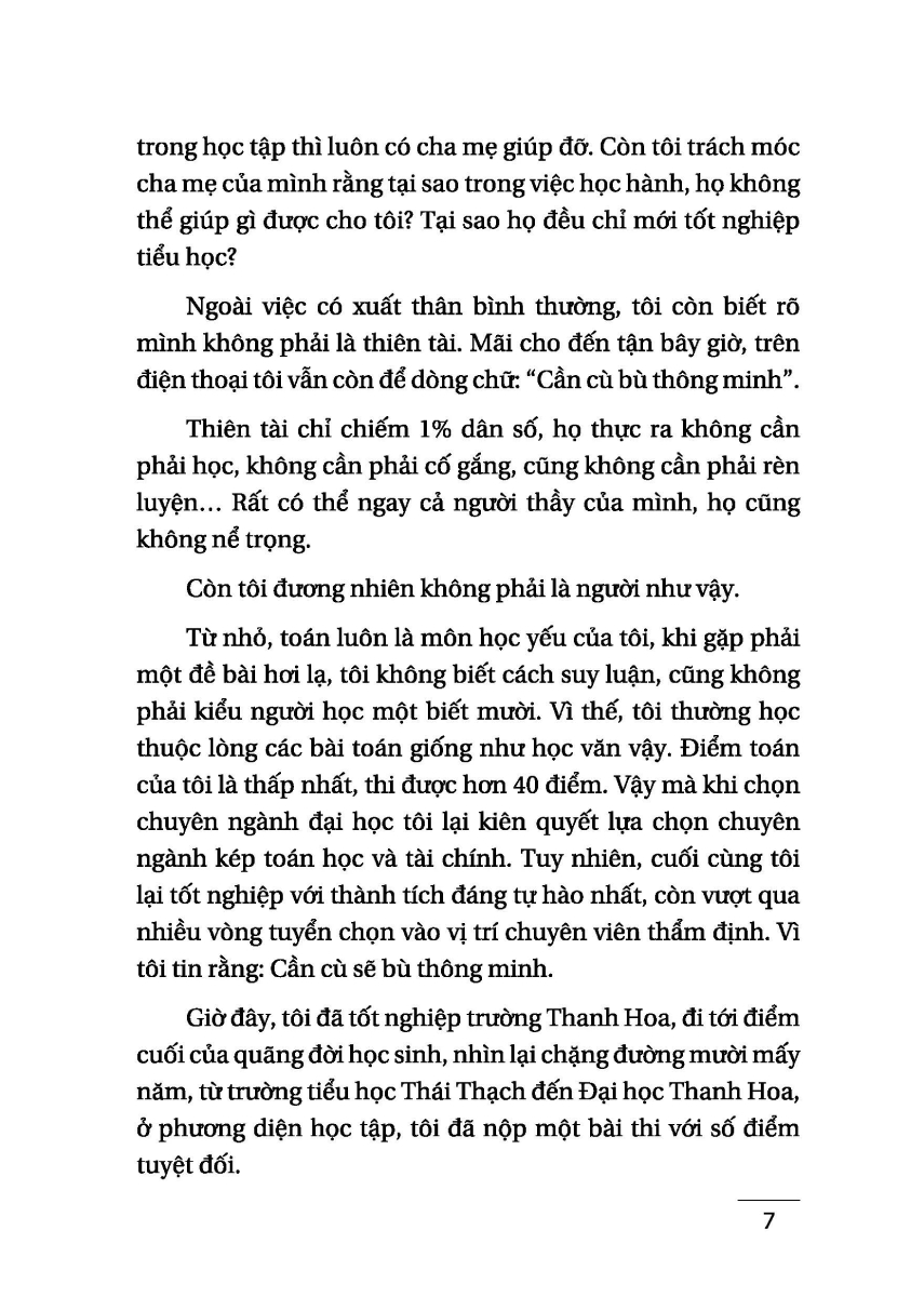 Cao Thủ Học Tập CAO THỦ HỌC TẬP - 2 giờ đọc cuốn sách này sẽ giúp bạn rút ngắn khoảng thời gian 20 năm học tập trong tương lai Làm thế nào để các bạn trẻ đang trong tình trạng mịt mờ có thể trở nên tốt hơn và mạnh mẽ hơn? Câu trả lời nằm gọn trong cuốn sách này. Nó như ngọn lửa không ngừng tiếp thêm cho bạn nguồn động lực vươn lên và cùng bạn theo đuổi ước mơ cao xa không giới hạn của mình. Cuốn sách cho chúng ta nhìn thấy được phương pháp học tập thiên về tiếp thu, phân tích, tổng kết, quy nạp của Trương Tự Hào. Đây là thứ mà rất nhiều người trẻ tuổi muốn thành công đang cần. Tác giả Trương Tự Hào là sinh viên đại học đầu tiên trong gia đình của anh; học giả Học viện Stephen A.Schwarzman – Đại học Thanh Hoa; thanh niên xuất sắc toàn cầu Davos; người sáng lập ra Plantag và là đại sứ thương hiệu Thanh niên Trung Quốc với Toeft. Anh sở hữu 5 triệu fan toàn cầu, kết hợp với quá trình tự lực trưởng thành từ một thiếu niên ở thị trấn nhỏ trở thành thạc sỹ đại học Thanh Hoa, sáng tạo và truyền tải những nội dung tri thức và phong cách sống, tái hiện lại trách nhiệm xã hội và tinh thần dũng cảm của lớp thanh niên trẻ tuổi ngày nay, ngày càng cổ vũ khích lệ được nhiều người hơn phấn đấu vươn lên. Nếu bạn có xuất thân bình thường, tư chất bình thường, nhưng đều muốn chinh phục mọi đỉnh cao trên con đường học hành. Nếu bạn có một xuất phát điểm tốt, tuy tài cao nhưng vẫn muốn phấn đấu nhiều hơn. Nếu bạn vừa tốt nghiệp, đứng nhìn cuộc đời với tương lai mờ mịt. Nếu bạn là một phụ huynh học sinh, hết lòng lo lắng cho sự trưởng thành của con cái. Vậy thì hãy dành ra hai tiếng đồng hồ để đọc quyển sách này, nó sẽ giúp bạn xóa mờ khoảng cách chênh lệch thời gian đến hai mươi năm. Sau đó, nó sẽ giúp bạn làm bài thi của mình trong trạng thái thoải mái nhất. Tác giả đề cập đến ba phần: Phá bỏ, đòn bẩy, nâng tầm. Đầu tiên, cần phải có một nền móng vững chắc, đạt tới trình “ưu tú”. Tiếp theo, vận dụng đòn bẩy cuộc đời, đạt tới trình “kiệt xuất”. Cuối cùng, xây dựng lại tư duy, nâng tầm nhận thức, làm bạn với thời gian và đạt tới trình “kiệt xuất bền vững”. Ngày nhỏ, tác giả từng rất ngưỡng mộ những bạn được cha mẹ chăm bẵm, khi gặp phải những vấn đề rắc rối trong học tập thì luôn có cha mẹ giúp đỡ. Anh cũng từng trách móc cha mẹ của mình rằng tại sao trong việc học hành, họ không thể giúp gì được cho mình? Tại sao họ đều chỉ mới tốt nghiệp tiểu học? Ngoài việc nhận thức bản thân có xuất thân bình thường, tấc giả còn biết rõ mình không phải là thiên tài. Bí quyết của anh luôn là: “Cần cù bù thông minh”. Thiên tài chỉ chiếm 1% dân số, họ thực ra không cần phải học, không cần phải cố gắng, cũng không cần phải rèn luyện… Còn đa số chúng ta không phải là người như vậy. Trong quá trình học tập, anh tổng hợp các bài thi thành một bộ hoàn chỉnh bao gồm phương pháp luận, kinh nghiệm và những điều tâm đắc, cách vận dụng trong thực tế, kết hợp với những câu chuyện thực tế xung quanh mình. Anh chia sẻ tất cả với trong cuốn sách này. Đây đều là những cách học hiệu quả nhất. Thông qua việc tự đánh giá lại những gì đã trải qua và truyền chúng cho người khác, bản thân tác giả cũng sẽ có cơ hội tự tổng kết lại để đương đầu với những sự cạnh tranh khốc liệt hơn trong tương lai. Đi trên con đường này, tác giả chứng kiến rất nhiều bạn đồng trang lứa rơi vào tình cảnh oái ăm “càng nỗ lực càng trở nên bình thường”, nhiều khi là do sự chênh lệch về thời gian gây nên. Có vài chuyện biết càng sớm sẽ càng tốt, có những người càng sớm được gặp gỡ thì càng sớm được học hỏi, có những kinh nghiệm càng sớm trải qua thì càng sớm được áp dụng... Thời gian có được những thông tin sớm hay muộn cũng sẽ dẫn tới sự chênh lệch về nhận thức, cuộc đời là quá trình “chi trả” cho sự chênh lệch nhận thức của bản thân. Cuốn sách này hoàn toàn không phải để hướng dẫn bạn làm sao để trở nên ưu tú, bởi vì đây quả thực là một việc quá đỗi đơn giản, hoàn toàn không cần đến một cuốn sách dày như thể này để giảng giải. “Ưu tú” chỉ là thứ căn bản, mọi thành công đều bắt đầu từ đó. Thế nên hãy làm thật tốt hai chữ “ưu tú” này. Khi có được nền tảng cơ bản rồi thì tương lai dù bạn có phát triển theo hướng nào, nó cũng đều đủ sức hỗ trợ cho bạn tiến xa và vươn cao hơn. Đứng ở hiện tại nhìn về những gì đã qua trong cuộc đời mình, tác giả phát hiện ra rằng, trong quãng đời học sinh, tiêu chuẩn để cân đong đo đếm hai chữ “ưu tú” thật quá đỗi đơn giản. Đó là thành tích. Vì vậy ở chương đầu tiên tác giả sẽ bắt đầu từ gia đình mình, nơi anh sinh ra, qua đó có thể giú