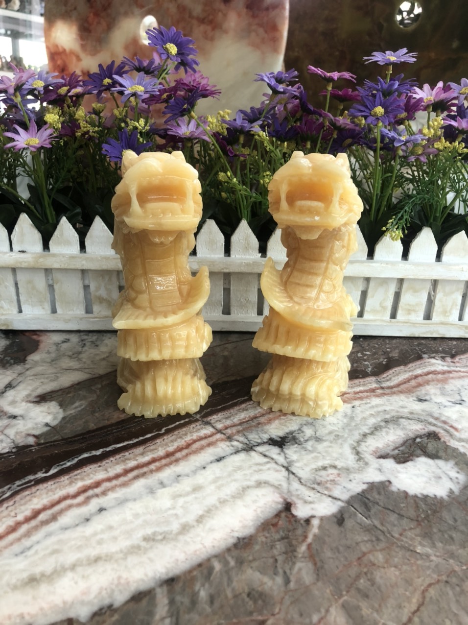 Hợp mệnh Thổ - Kim Chất liệu: Đá cẩm thạch vàng cà rốt Kích thước: Dài 15 cm X Rộng 6 cm x Cao 12,5 cm Khối lượng: 3,2 kg / cặp Ý nghĩa Tỳ