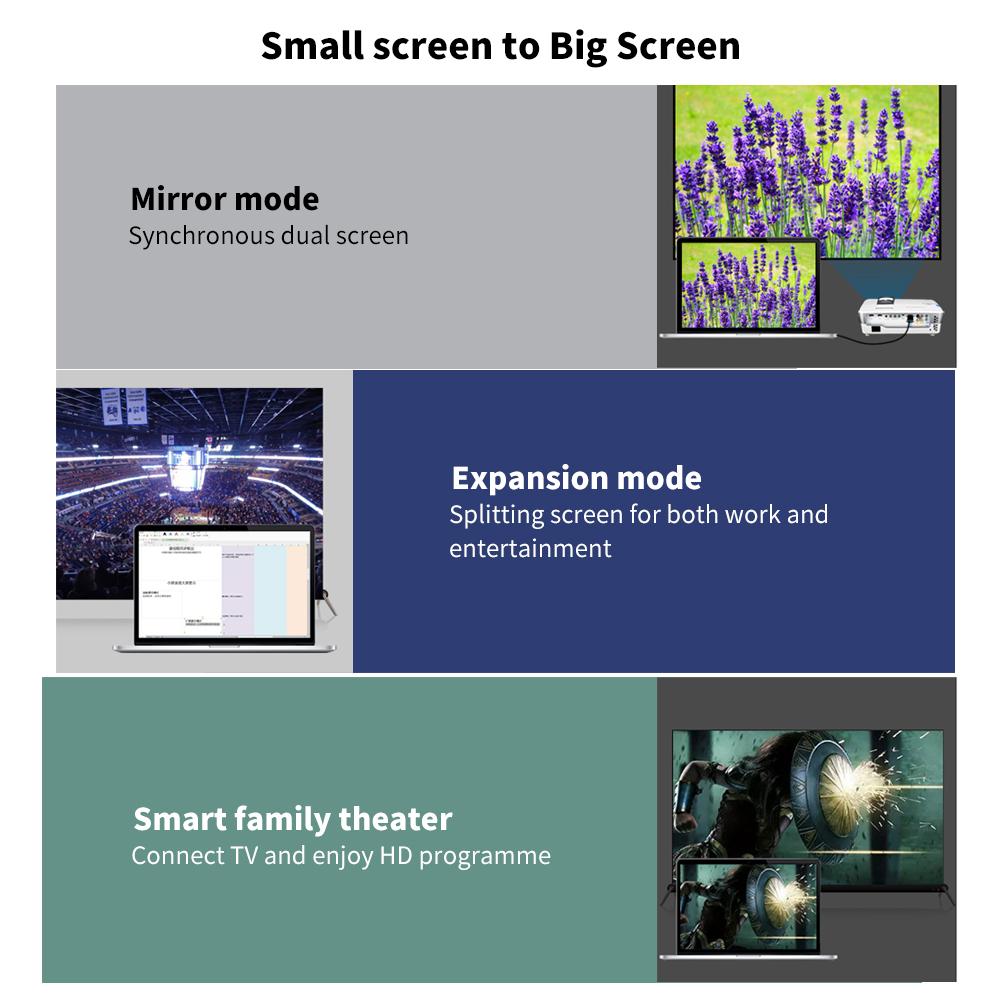 It supports mirror mode for synchronous dual screen and expansion mode of splitting screen for both work and entertainment.