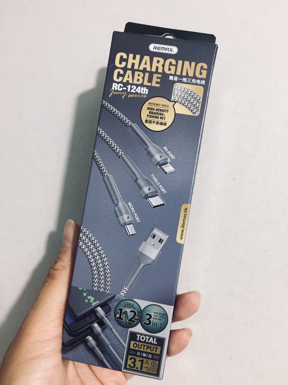 Cáp sạc 3 đầu đa năng thương hiệu Remax -Model: RC199th -Sản xuất tại: Trung Quốc Mô tả: -Giao diện: USB to C+ip+Micro -Dòng sạc : ● Type-C: 4.5V-5A 10V-4A ● iP: 5V-2.4A ● Micro: