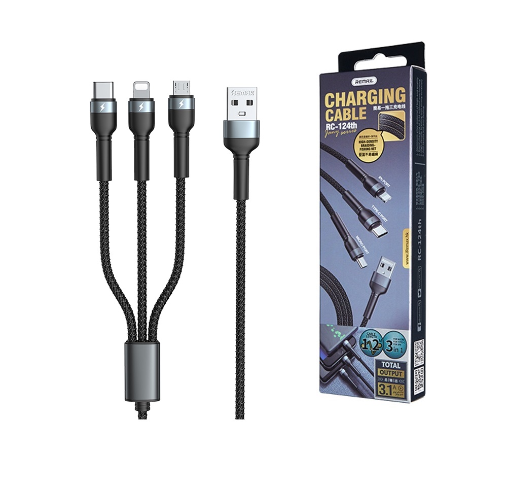 Cáp Sạc Điện Thoại Đa Năng 3 Đầu Sạc Remax RC-124th Tích Hợp 3 Cổng Ip/Type C/MicroUSB Dòng Max 3.1A
