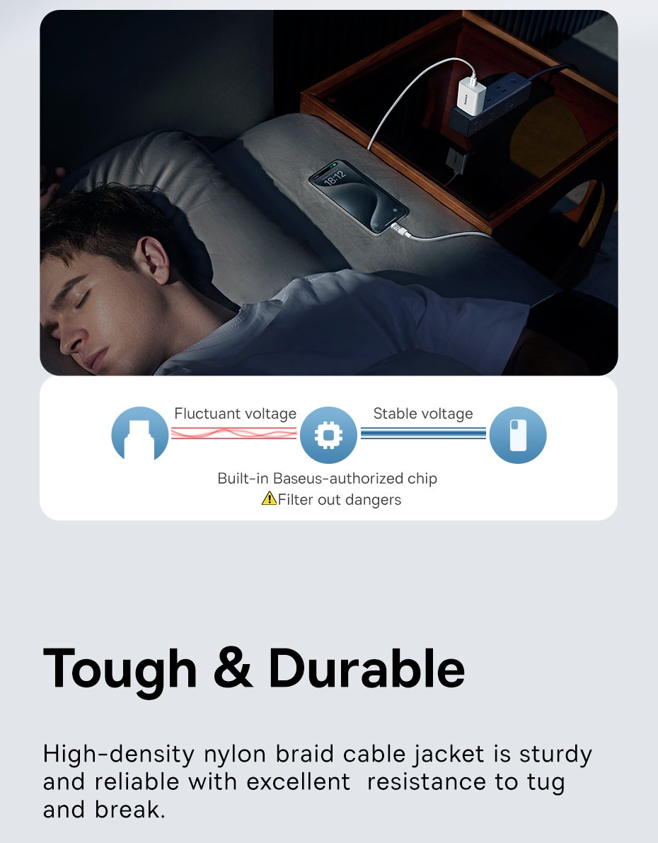 Cáp sạc nhanh 240W, bền bỉ, chịu được hơn 10.000 lần uốn cong, phù hợp cho các thiết bị công suất cao. Thông tin sản phẩm: Công suất: 240W Tốc độ truyền dữ liệu: 480Mbps Chiều