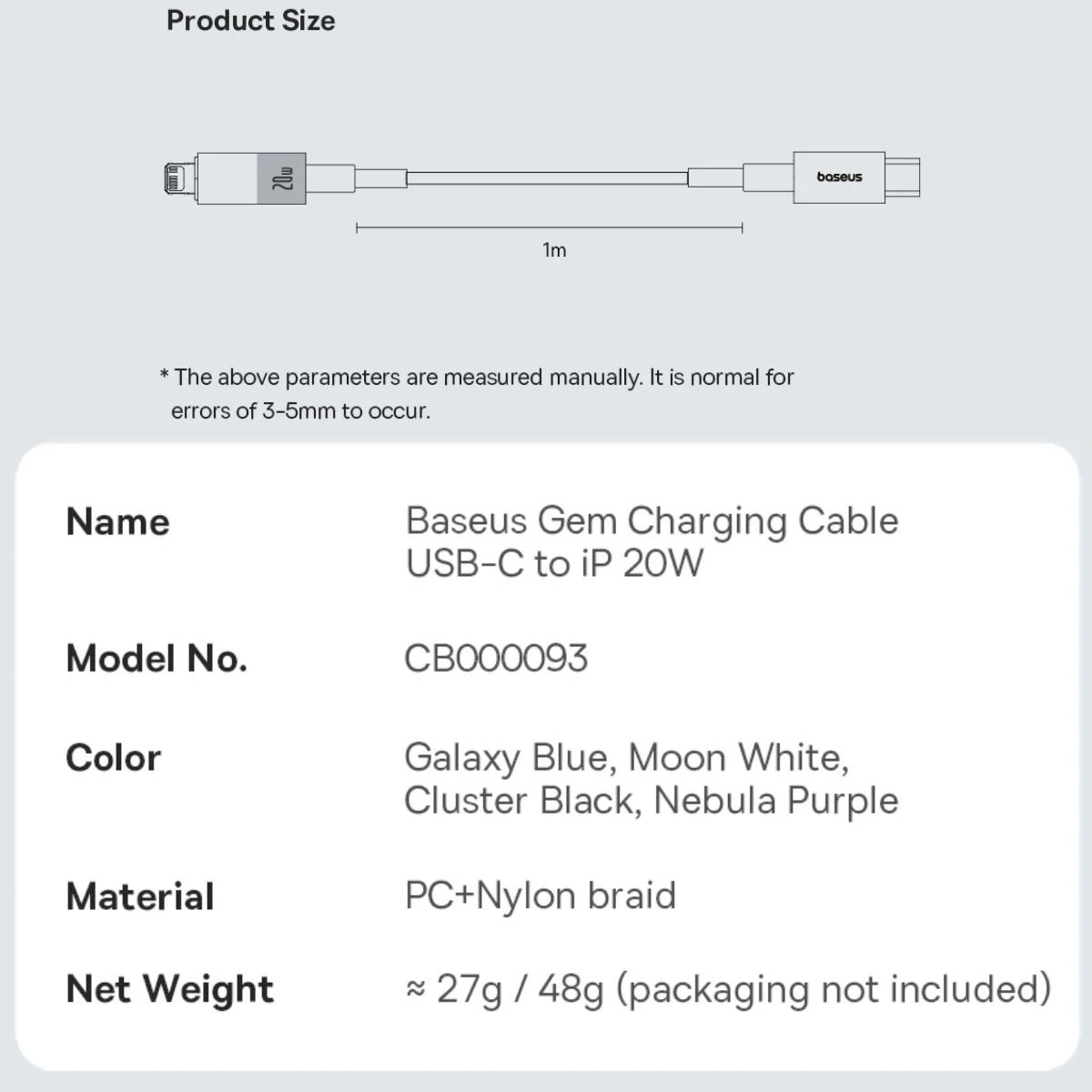 - Cáp Baseus Gem được thiết kế với chất liệu cao cấp, vỏ bọc ngoài làm từ sợi nylon bện chắc chắn, chống xoắn, bền bỉ và dễ dàng chịu lực kéo. Thiết kế gọn nhẹ cùng màu sắc tinh tế giúp cáp trở thành một phụ kiện không chỉ bền mà còn đẹp mắt, phù hợp với các thiết bị hiện đại. Đặc biệt, cáp có 2 độ dài 1M và 2M, giúp người dùng linh hoạt lựa chọn theo nhu cầu sử dụng, từ việc sạc ở bàn làm việc đến sử dụng trong ô tô.