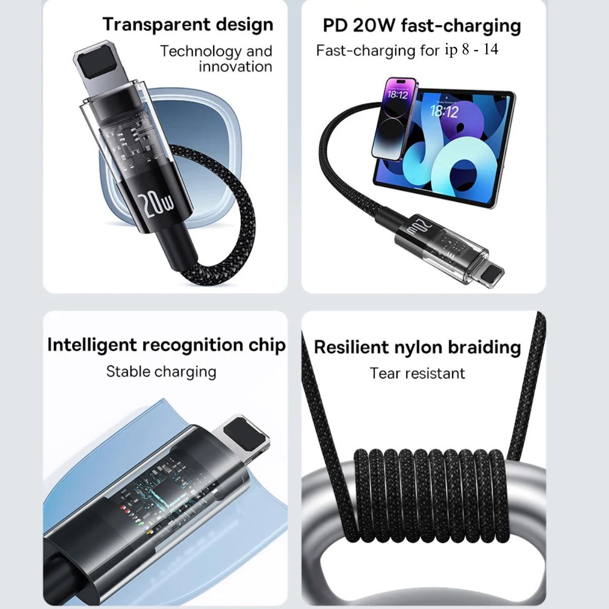 - Với khả năng hỗ trợ sạc nhanh 20W, cáp sạc Type C to Light-ning Baseus Gem giúp rút ngắn thời gian sạc cho các thiết bị Ap-ple như iP, i-Pad, và Air-Pods. Nếu bạn đang sở hữu một chiếc iP 12 hoặc mới hơn, cáp này sẽ cung cấp khả năng sạc nhanh hơn rất nhiều so với những cáp sạc thông thường, giúp bạn tiết kiệm thời gian và luôn sẵn sàng cho công việc.