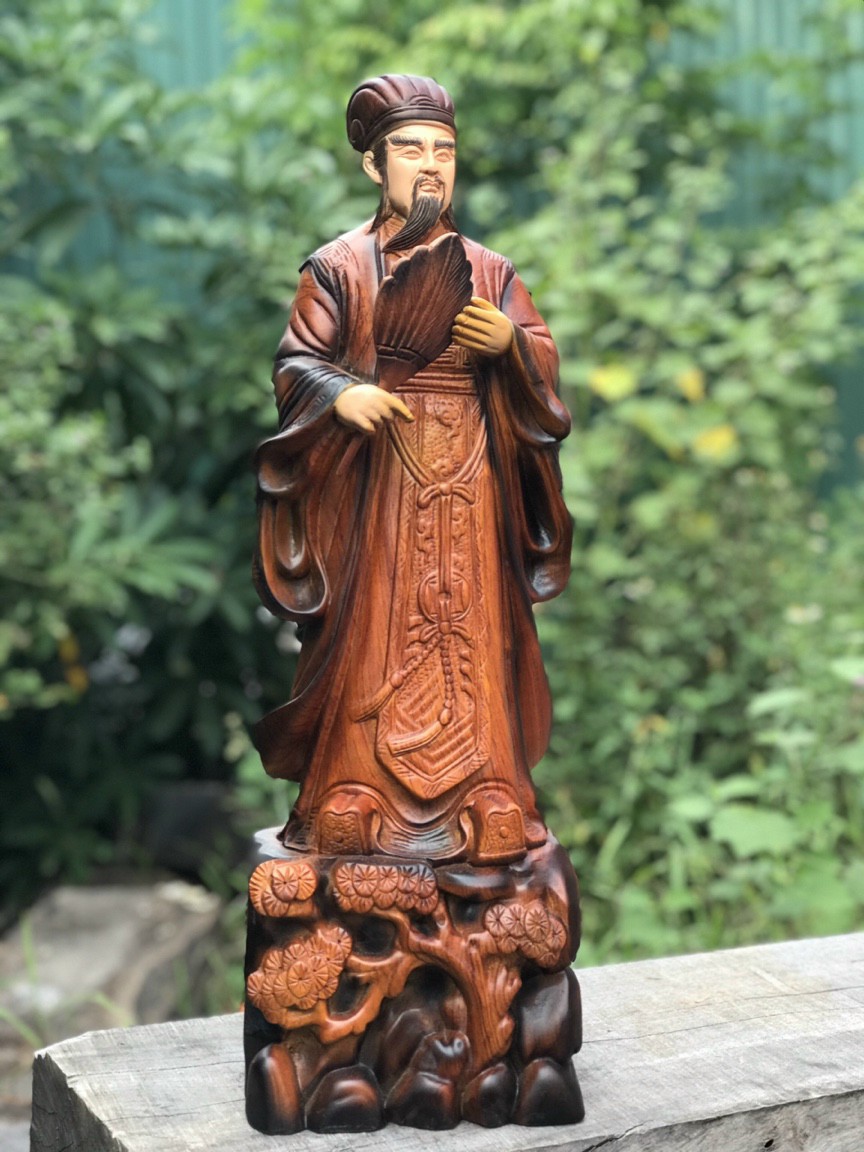 _ Cặp tượng khổng minh và quan công .Được trạm khắc tỉ mỉ tinh sảo kỳ công .Đi hầu hết tất cả mọi chi tiết góc ngách của tượng đều được ngọt tỉa chỉnh sửa hoàn tòan bằng tay thủ công .Đồng thời cặp tượng được ngọt tỉa chỉnh sửa hoàn toàn bằng tay thủ công .Kết hợp với trà nhám đánh giấy giáp nhiều nước cho gỗ khô kiệt .Mục đích trống dập nứt vênh mo mối mọt .Kết hợp với trà nhám ,đánh giấy giáp nhiều nước cho sạch sẽ ,Sờ mát lạnh rồi cho vào phun lót làm bóng mờ để giữ lại mầu sắc vân gỗ tự nhiên .Tượng được làm và hoàn thiện do bàn tay khối óc tài hoa .Từ những người thợ giàu kinh nghiệm ,Cũng như tay nghề cao trong làng nghề truyền thống .Chính vì thế cặp tượng văn võ song toàn đã đáp ứng đầy đủ những tiêu trí ( Đẹp bền rẻ ) Thẩm mỹ nghệ thuật với chất lượng tuyệt vời