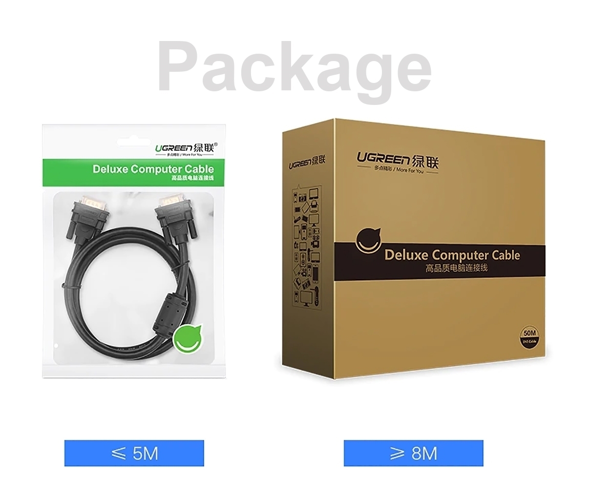 Ugreen 11645 Cáp DVI 24+1 Dài 30M DVI24+1 male to male cable gold plated DV101 1. Length : 1M 2. Color : Black 3. DVI24+1 male to male cable gold plated 4. 3000 g 5.