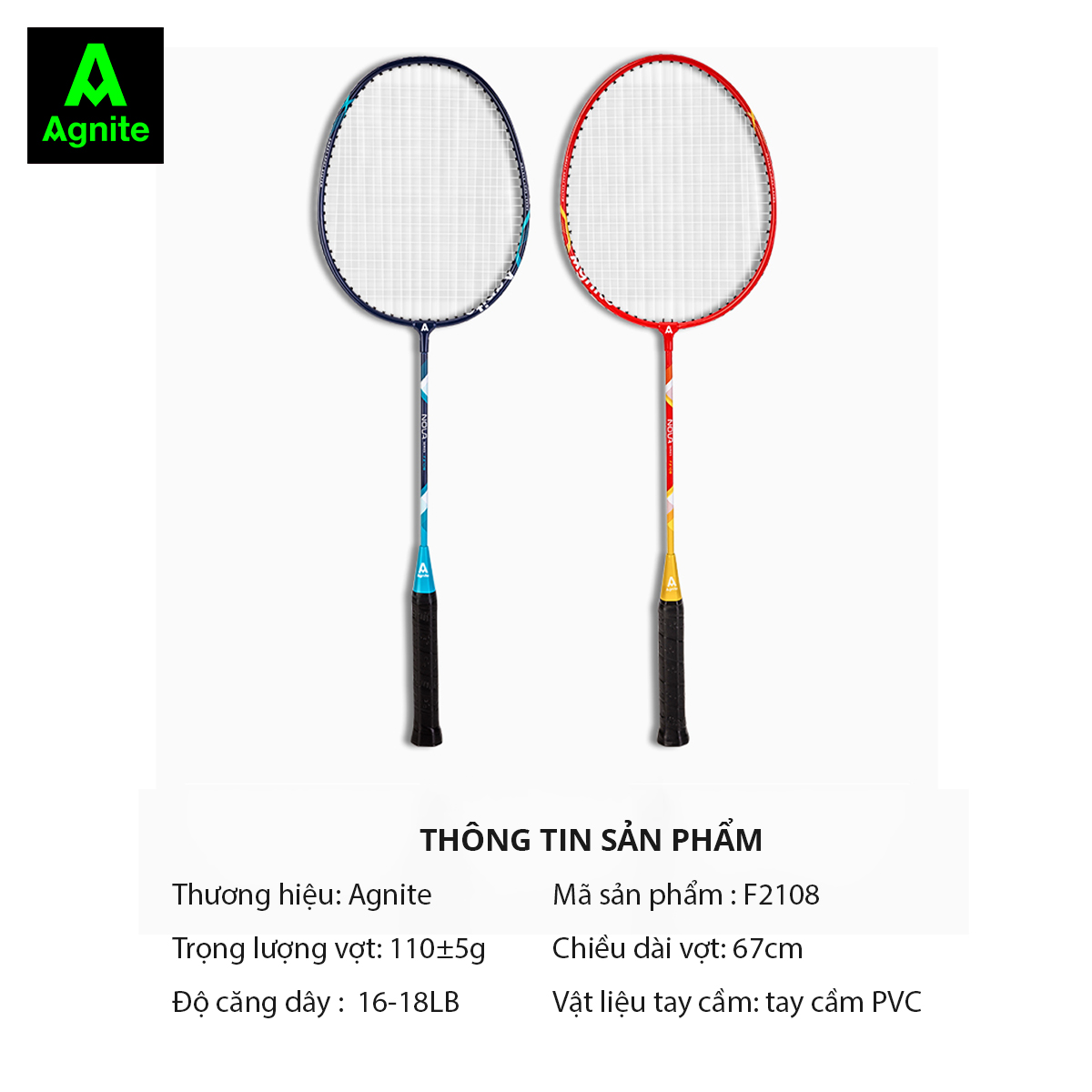 THÔNG SỐ CƠ BẢN Thương hiệu: Agnite Mã số: F2108 Số lượng: Hai chiếc Màu sắc: xanh lam + đỏ Trọng lượng vợt: 110 ± 5g Độ cứng thanh: cứng Lực căng dây: 16-18LB Chiều