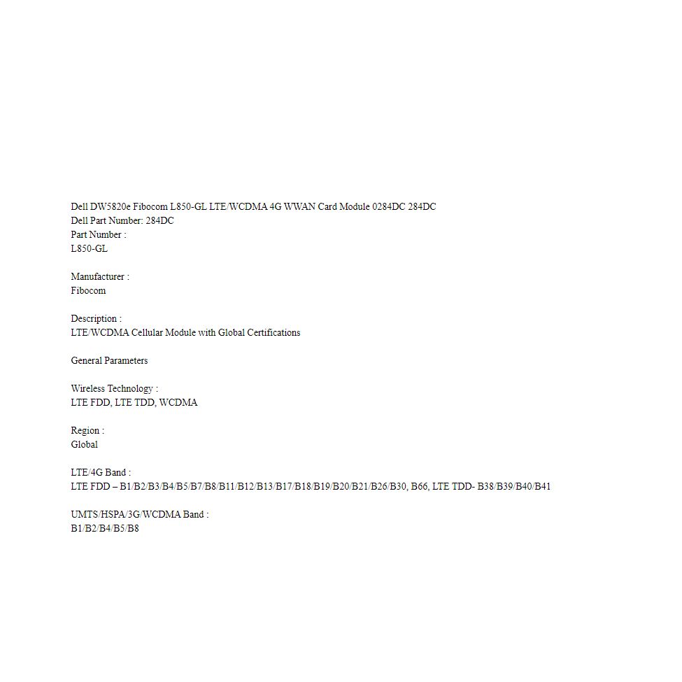 • Dell DW5820e Fibocom L850-GL LTE/WCDMA 4G WWAN Card Module 0284DC 284DC